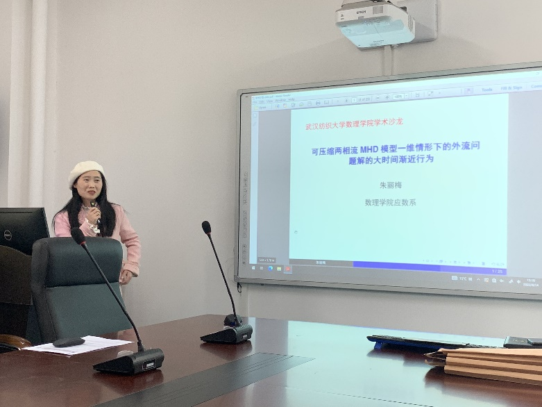 朱丽梅博士的报告题目为“可压缩两相流MHD模型一维情形下的外流问题解的大时间渐近行为”,她首先介绍了可压缩两相流MHD模型的由来,该模型是由朱丽梅及导师对Vlasov-Fokker-Planck/MHD方程组通过伸缩变换,令参数趋于0, 取极限得到。首先找到当时间T趋于无穷远处时的稳态方程,证明了该稳态方程解的存在唯一性。最后一维两相流MHD模型与稳态方程作差,得到扰动方程解的代数衰减估计,即研究了大时间渐近行为。