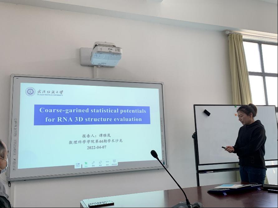 谭雅岚博士做了题为“Coarse-grained statistical potentials for RNA 3D structure evaluation”的报告,汇报了近期的工作。报告首先介绍了统计势的研究背景以及基本原理,随后简介了本人及合作导师近期发表在《Biophysical Journal》杂志上的高性能全原子统计势rsRNASP。依据rsRNASP的构建原理,介绍了最近提出的在不同粗粒化层面构建的粗粒化统计势(cgRNASP、cgRNASP-PC以及cgRNASP-P),并进一步展示了其性能、运行效率以及提取得到的RNA三维结构中重要的相互作用。最后,对粗粒化统计势的进一步研究和应用做出了总结和展望。