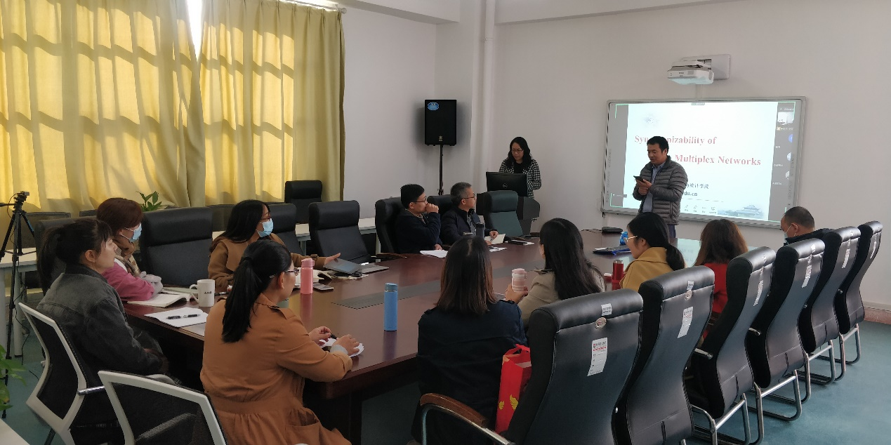 为贯彻学校第二次党代会上提出的“学术实力强、培养质量高、育人环境美、文化氛围浓、办学声誉好”美好纺大建设愿景,大力促进学科交叉、加强团队合作、提高学术能力、增强学术自信,在学院大力支持下,第40期学术沙龙活动于11月25日在应用数学与交叉科学研究中心研讨室成功举办。本次活动邀请到复杂网络领域国内知名专家武汉大学数学与统计学院吴晓群教授,报告题目为:Synchronizability of Multiplex Networks。由于受到疫情影响,本次活动采取线上线下相结合方式,信息与计算科学系和数学与应用数学系相关专业老师线下参与,其他系部老师线上参加。学院副院长张本龚教授主持本次活动。