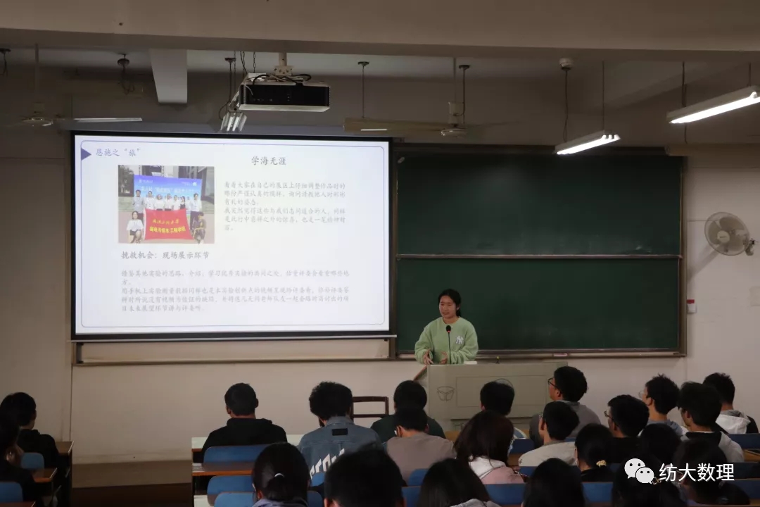 在此之后,学生代表马清奎分享了自己的数学建模心得体会和作品。他向同学们分享宝贵的参赛经验 ,并建议同学们做好基础知识准备,找好队友,及时总结经验。学生代表张驰以分享课题《知微见著——创新源于细节》的方式,介绍了参赛的完整过程。他提出竞赛可以提高表达能力,考验临场反应,锻炼心理素质,提升自我能力,开拓眼界,也会成为考研就业的加分项。学生代表李瑾以幽默的方式给同学们分享课题《色彩的秘密-虹与霓的设计与再现》,她向大家描述了在研究过程中遇到的难题,以及一波三折的参赛经历和丰富的收获。她告诉同学们要同优秀的人前行,从优秀的力量中汲取自己的力量,道阻且长,行且将至。