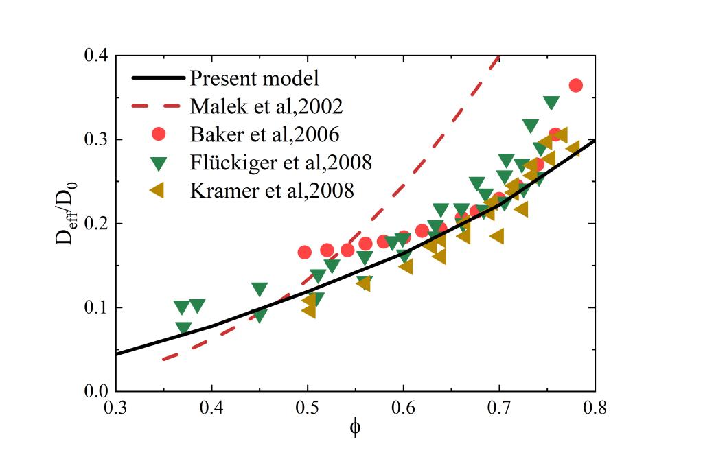 《Fractals》(IF:3.665)在线接收题为:Effective gas diffusion coefficient of fractal porous media with rough surfaces by Monte Carlo simulations的论文,该论文通讯作者为我校应用数学与交叉科学研究中心郑仟副教授,第一作者为研究生尹作壮同学。气体扩散系数是表征多孔介质输运特性的一个重要参数。本文基于微观毛细管的分形特征,采用蒙特卡罗方法研究了毛细管表面粗糙度对气体扩散的影响,提出了粗糙表面多孔介质有效气体扩散系数的概率模型。该模型表示为多孔介质几何参数的函数,如孔隙度、孔隙分形维数、迂曲度分形维数和相对粗糙度。论文着重探讨了相对粗糙度对有效气体扩散系数的影响,结果表明,粗糙表面多孔介质的有效气体扩散系数随着相对粗糙度的增加而减小。此外,该研究还详细分析了多孔介质其它结构参数对气体扩散的影响。该模拟方法可推广用于粗糙表面分形多孔介质中的气体流动和传热过程的分析。