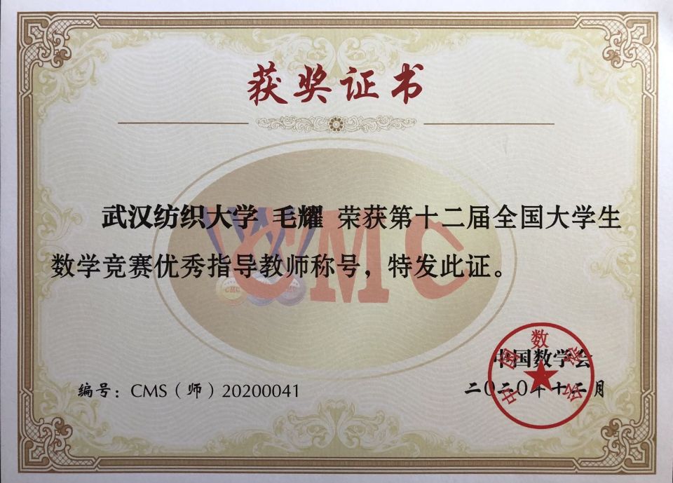 同时,毛耀老师荣获“第十二届全国大学生数学竞赛优秀指导教师称号”,旨在表彰其2020年及以前在全国大学生数学竞赛中的付出与贡献。该奖项为中国数学会在全国范围内第一次评选,本次湖北省仅有5位老师获此殊荣。