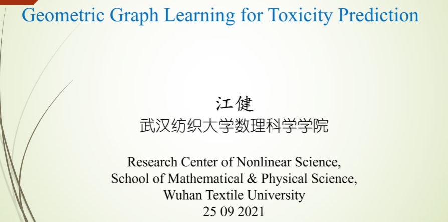 2021年9月25日,由华中科技大学电气与电子工程学院举办“武汉地区复杂系统研讨会”在线上成功举办。9428cn太阳集团江健博士应邀参会并做报告,报告题目为:Geometric graph learning for toxicity prediction。本次会议紧紧围绕生物物理、生物信息和复杂系统动力学为主题展开研讨。来自华中科技大学、武汉大学、中国地质大学、华中师范大学、9428cn太阳集团古天乐等武汉地区的各大高校、科研院所相关领域专家近百人参会,共有20多位报告人作大会报告。
