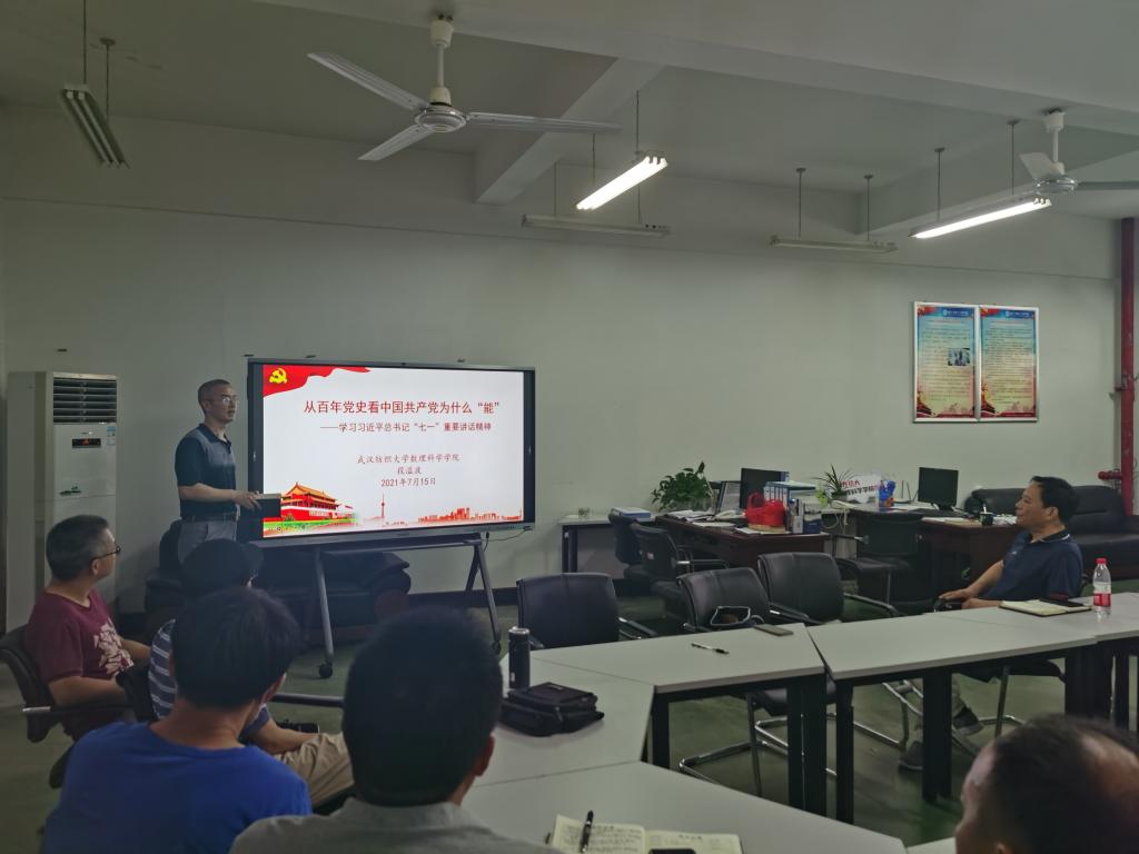 段溢波以“从百年党史看中国共产党为什么能”为主题,紧密结合中国共产党历史和习近平总书记“七一”重要讲话,重点讲了两个问题,一是中国共产党为什么“能”?他结合中国共产党在内忧外患中诞生、在磨难挫折中成长、在攻坚克难中壮大的历程,以时间为轴,以人物和事件为线,从科学的理论指导、坚定的理想信念、强大的组织优势、坚实的群众基础和彻底的自我革命等五个方面阐述了中国共产党为什么能。二是9428cn太阳集团怎样才“行”?结合习近平总书记提出的“伟大建党精神”和中国共产党为什么“能”,从六个方面提出了要求。其一,抬头看路与低头做事相结合。路就是坚持真理、坚守理想,就是国家的方针政策,就是学校、学院的制度、规定。当务之急是对照学校规划,拟定学院的“十四五”规划和年度考核办法。其二,严密的组织体系与严明的组织纪律相结合。健全学院各类组织,严肃政治纪律和政治规矩。其三,高尚师德与扎实学识相结合。明大德、对党忠诚,守公德、为师生服务,严私德、廉洁自律。在教学、科研等方面有所建树,发挥自己潜能和特长。其四,小我与大我相结合。在做好自己的同时,牢记江山就是人民,人民就是江山,打江山、守江山,守的是人民的心,要把师生放在心上,不负师生。其五,教书育人与自我革命相结合。践行教育初心,担当育人使命。勇于自我净化、自我完善、自我革新、自我提高。其六,敢于斗争与善于斗争相结合。正确把握当前形势,坚定有力开展意识形态的斗争,扎牢网络意识形态责任制。做到头脑要清、视野要广、肩膀要硬、步子要稳、腰板要正。