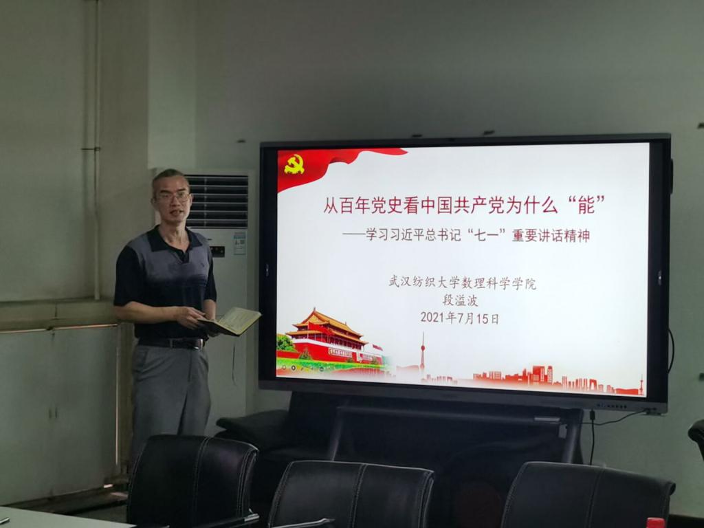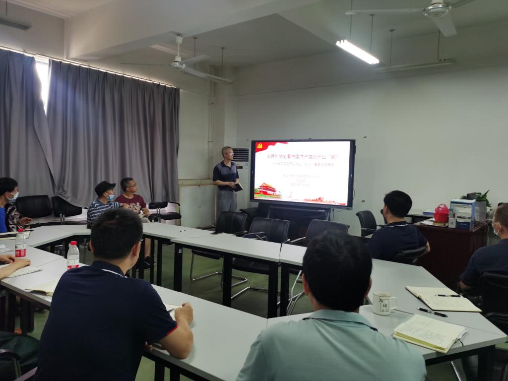 2021年7月15日上午,9428cn太阳集团组织党委中心组开展党史学习教育读书班集中学习活动,学院党委书记段溢波做主题报告。