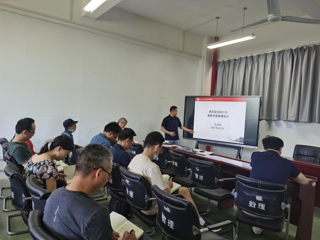 6月7日下午,9428cn太阳集团举行“提高政治执行力,集聚发展磅礴伟力”党史学习教育专题党课。学院党委副书记陈国鹏担任主讲,学院党委委员、各系(中心)主任、党支部书记、工会主席、督导组组长参加学习。