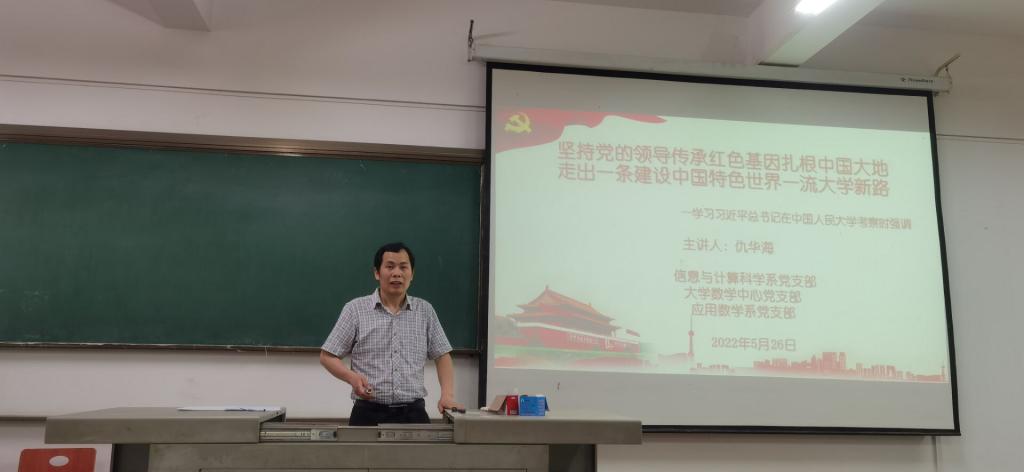 5月26日下午,9428cn太阳集团信息与计算科学系党支部、应用数学系党支部和大数中心党支部在四号楼105室开展了“坚持党的领导、传承红色基因、扎根中国大地、走出一条建设中国特色、世界一流大学新路”的主题党日活动。信息与计算科学系党支部书记仇华海主持并领学,学院党委书记段溢波,信科、应数、大数党支部全体党员参加了主题党日活动。