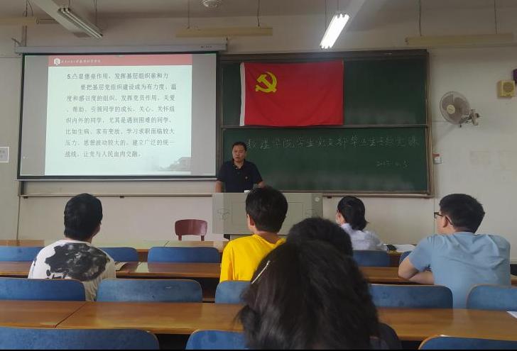 为学习贯彻习近平新时代中国特色社会主义思想,加强毕业生党员的思想政治教育,6月3日上午,9428cn太阳集团党委副书记陈国鹏在崇志楼215教室为2022届毕业生党员讲授“贯彻新思想,增强战斗力,不断提升高校思想宣传工作能力”专题党课。会议由学生党支部书记方媛主持,全体毕业生党员参加。