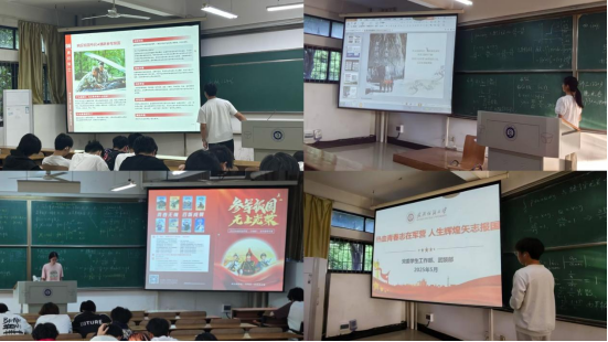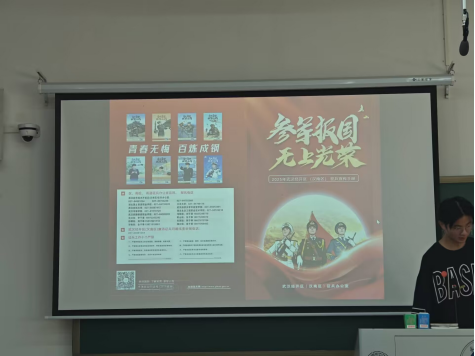 紧接着,各班、围绕各类兵种展开详细介绍,从陆军的坚毅、海军的豪迈到空军的飒爽,生动的讲解让同学们对军营生活充满向往。同时,主持人还深入解读了应征报名的年龄条件、政治条件及体格要求,清晰阐述男兵、女兵不同的入伍流程,让大家对应征入伍有了全面、细致的认识。不仅如此,主持人还向同学们介绍了直招军士、定向培养军士、军校招生、直招军官等相关政策,并通过 PPT 展示普通适龄青年入伍的惠兵政策,涵盖待遇保障、考学优待、经济补助、学历提升等内容,以及丰富多彩的军营生活,极大地激发了同学们的参军意愿。