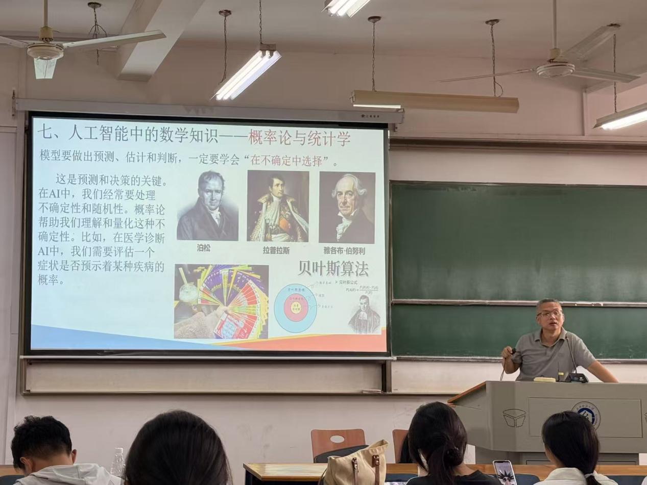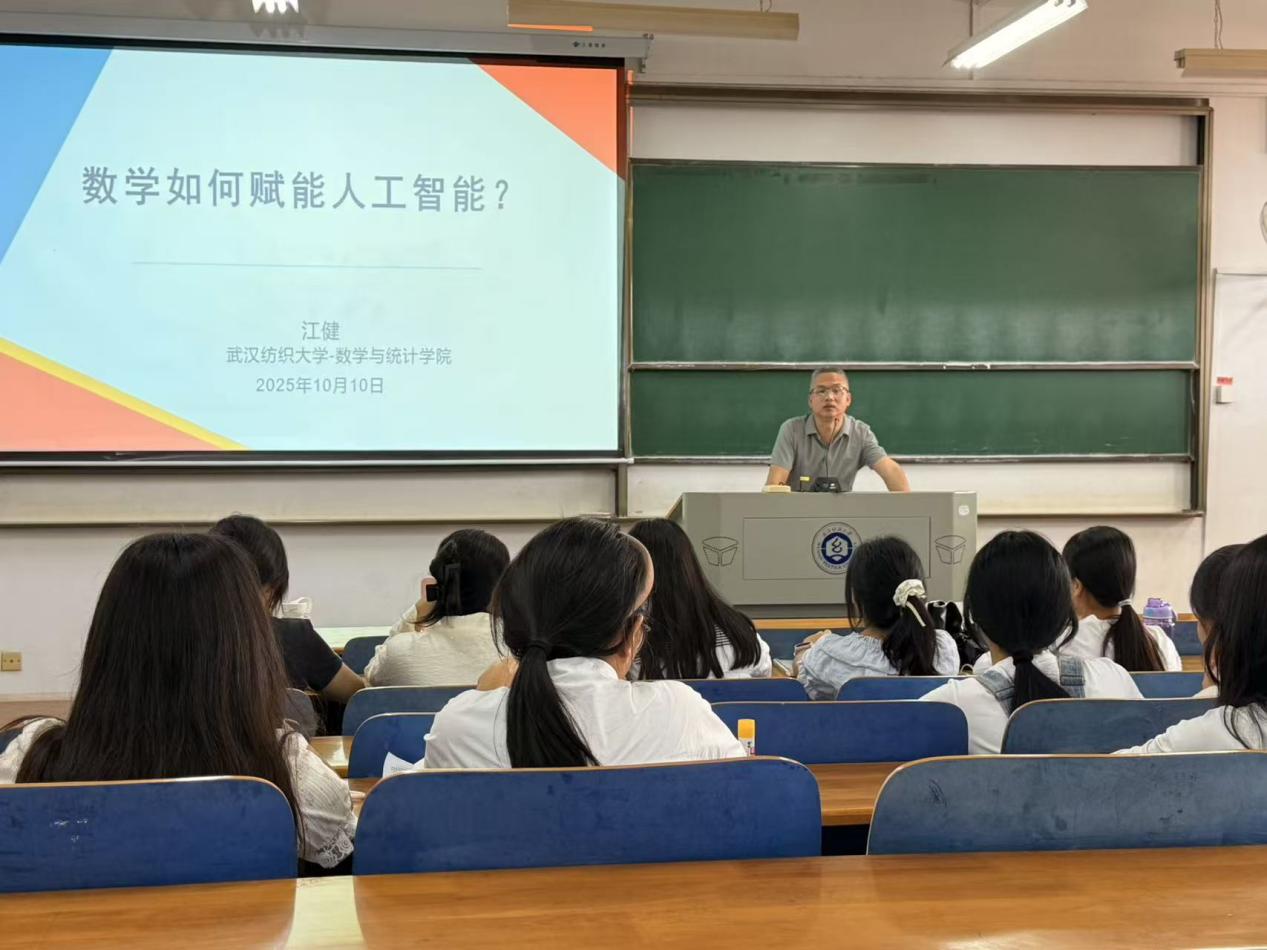为深入解析数学与人工智能的内在关联,助力学生们洞悉AI技术底层逻辑,数学与统计学院于2025年10月10日在三栋教学楼举办了“数学赋能人工智能”主题讲座。本次讲座由江健老师担任主讲人,数学与统计学院2025级新生积极参加,讲座圆满完成。