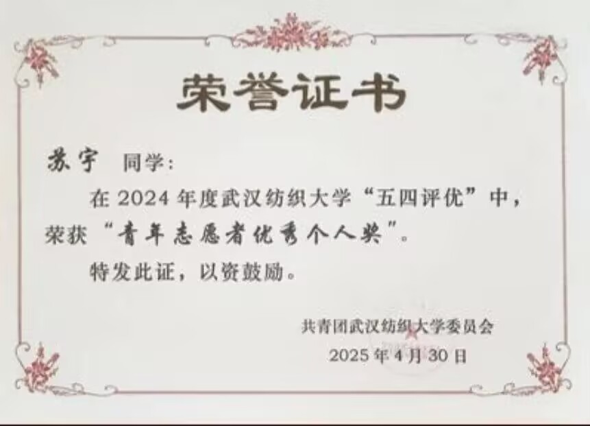 学生工作与志愿活动中,苏宇践行着“在服务中成长”的真谛。无论是担任学习委员协助老师处理班级学业事务,还是作为院体育部部长、乒乓球副队长组织各类文体活动,她都尽心尽力、踏实履职,用责任与热忱为师生服务。作为乒乓球爱好者,她将运动中的竞技精神融入学习与工作,做到全面发展。在志愿活动中,她始终怀揣热爱,不把服务当作简历上的装饰,而是在帮助他人的过程中锤炼品格、遇见更好的自己,用实际行动传递青春正能量。