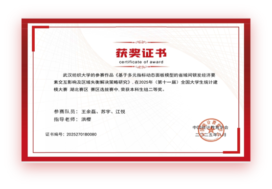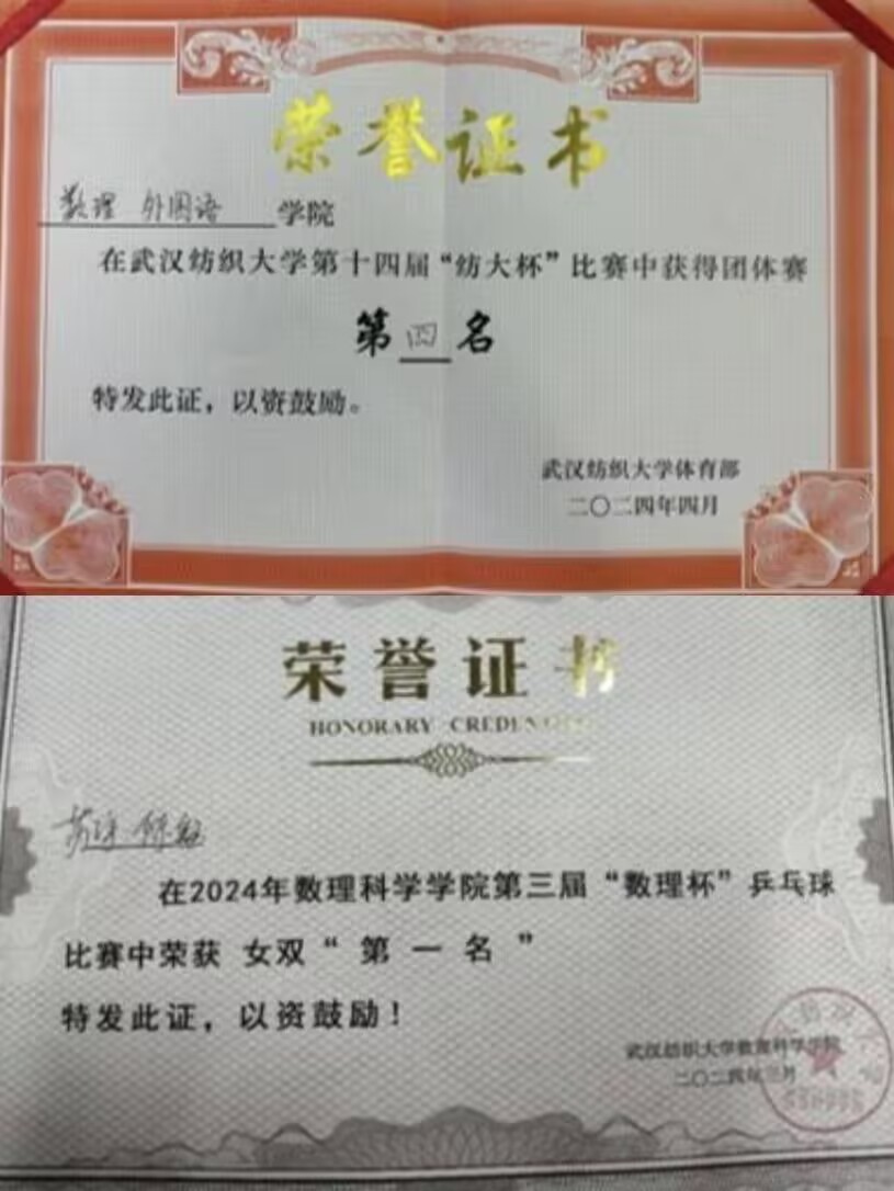 苏宇,女,汉族,共青团员,数学与统计学院应数12301班学生,现任应数12301班学习委员,曾任院体育部部长、院乒乓球副队长。曾获2023-2024学年一等学业奖学金,主持2024年大学生创新创业训练计划省级立项一项。获2023-2024学年三好学生,青年志愿者优秀个人等荣誉称号;在专业竞赛中屡创佳绩,获第十七届“华中杯”大学生数学建模挑战赛一等奖、第十一届全国大学生统计建模大赛二等奖;学习之余,积极进行体育运动,在9428cn太阳集团古天乐第十四届“纺大杯”比赛中斩获团体赛第二名,用全面发展的实绩诠释了新时代青年的青春担当。