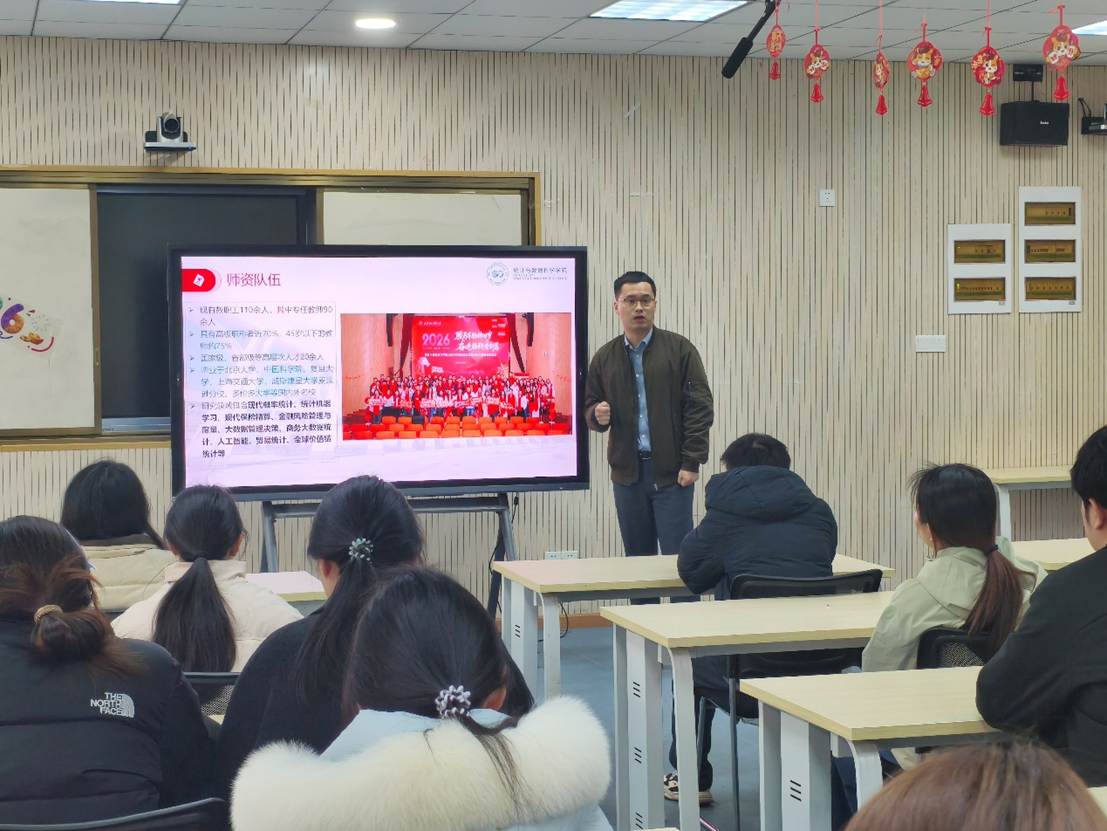 会议伊始,范鸣老师先介绍了上海对外经贸大学的办学底蕴、校区分布、学科布局等整体概况,再详细解读其统计与数据科学学院的发展历程、组织架构及本硕博完整培养链条,阐释了统计学、数量经济学等核心专业的学科优势。同时展示了该院雄厚的师资与科研实力,研究方向覆盖现代概率统计、机器学习等前沿领域;从产教融合、国际交流等方面阐述人才培养特色,并通过数据可视化图表直观展示毕业生升学、就业等发展情况。此外,范鸣老师还详细解读了上海对外经贸大学统计与数据科学学院2026年研究生招生专业与学制,并对报考流程、备考重点、导师选择等同学们关心的问题进行了细致解答。