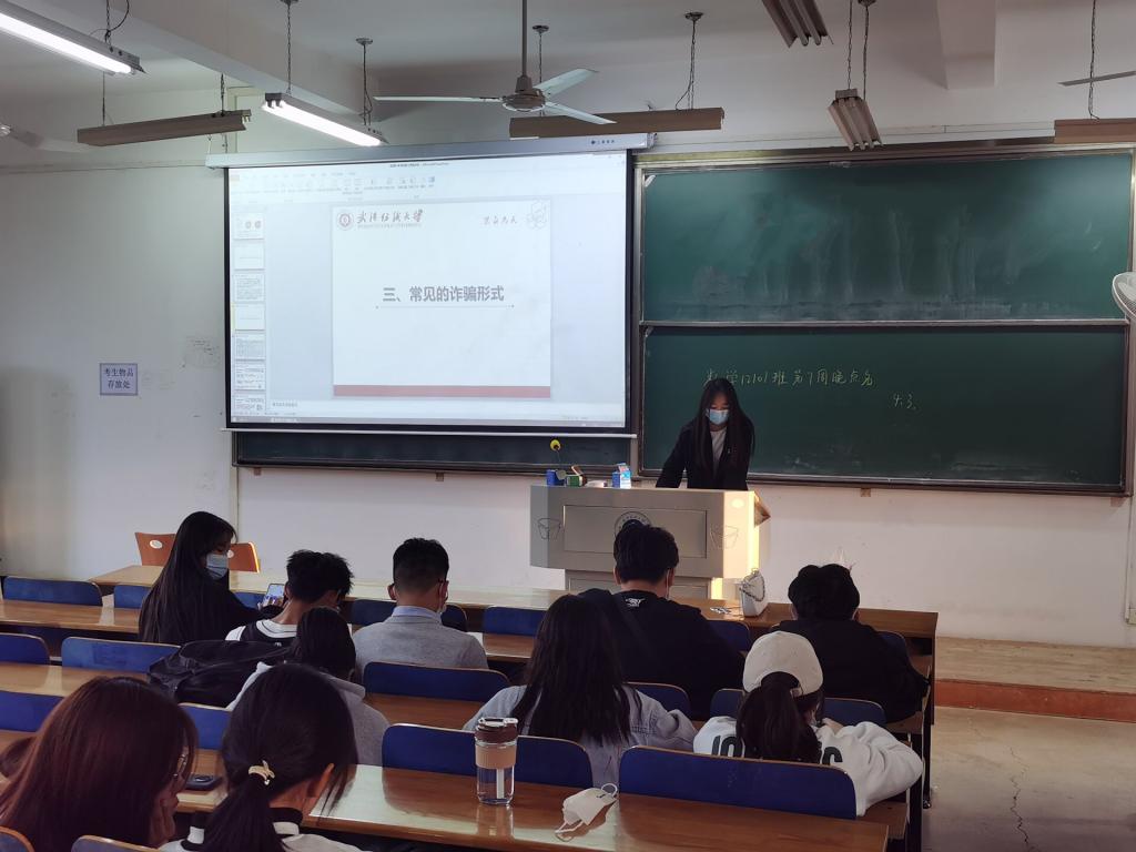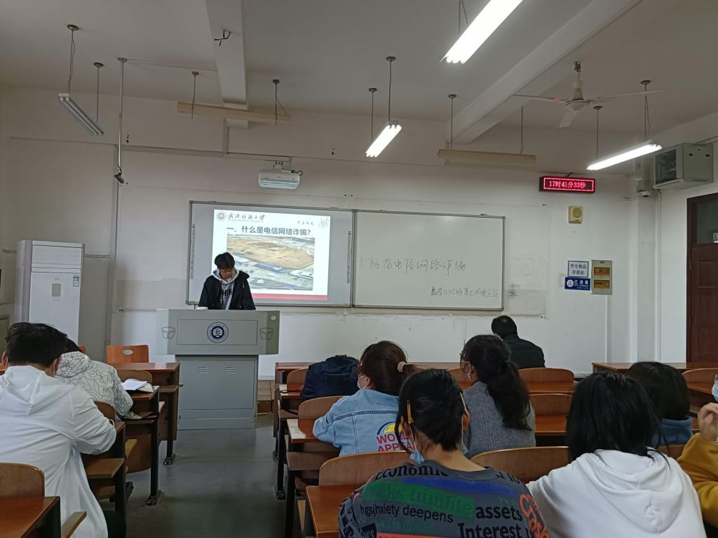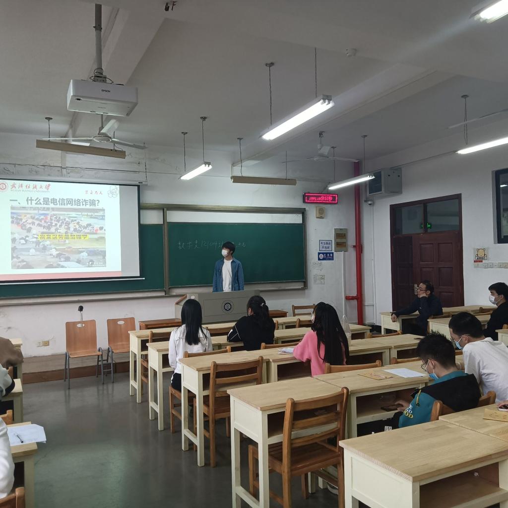 会议伊始,各班班长以讲解PPT的方式带领各班学生观看防诈骗小视频,了解新型电信诈骗骗局的类型,并就“什么是电信诈骗”“学校电信网络诈骗发案情况”“常见的诈骗形式”“如何防范识别电信诈骗”四个方面内容进行详细讲解。会上,各班班长强调,在遇到涉及人身财产安全的突发事件时,要沉着冷静,不要轻信他人,不给犯罪分子可乘之机。同时指出同学们要提高预防电信诈骗的能力,学习防范诈骗的基本知识,遇到实际问题,忌盲目,多思考。班会接近尾声,各班团支书就当前疫情防控提出几点要求,提醒同学们落实好“打疫苗、做核酸、戴口罩、勤洗手、常通风、少聚集”等个人防护措施。养好个人习惯,健康规律生活,适当锻炼身体。科学佩戴口罩,牢记常态化疫情防控下的安全防范知识与注意事项,做好长个人健康管理。