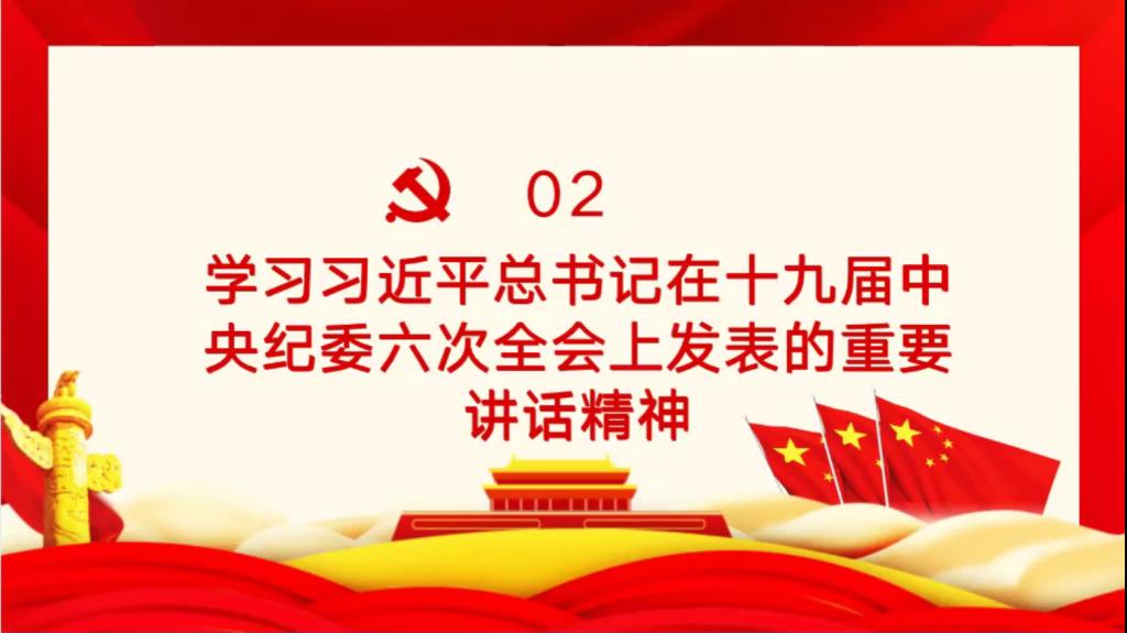 全体党员学习《习近平总书记在十九届中央纪委六次全会上发表的重要讲话》。讲话强调要坚持严的主基调不动摇,坚持发扬钉钉子精神加强作风建设,坚持以零容忍态度惩治腐败,坚持纠正一切损害群众利益的腐败和不正之风,坚持抓住“关键少数”以上率下,坚持完善党和国家监督制度,以伟大自我革命引领伟大社会革命,坚持不懈把全面从严治党向纵深推进。