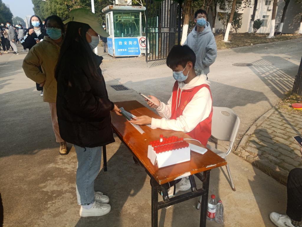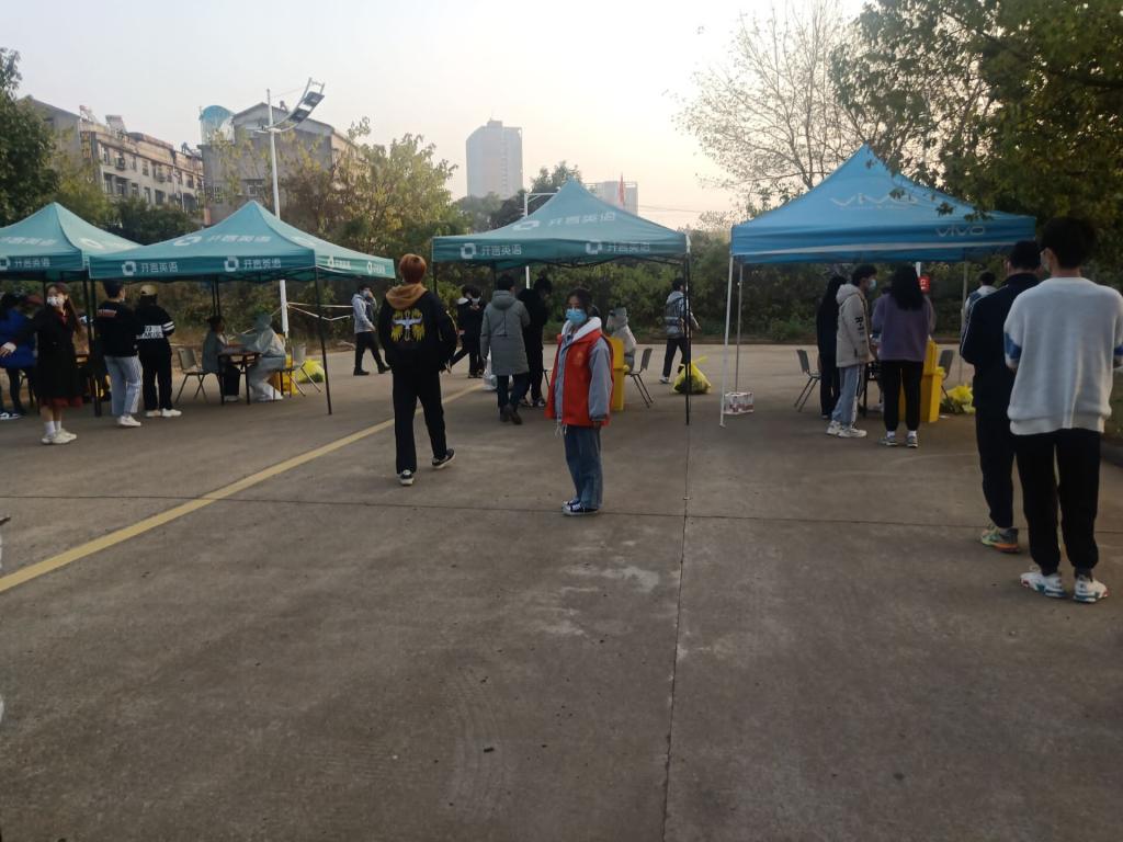 核酸检测工作开始前,数理学院志愿者开始着手志愿棚的搭建,清点所需物品,指导志愿人员工作。核酸检测工作正式开始,每条队伍长达数十米,整个场地放眼望去尽是人海,带队志愿者穿梭队伍,疏导队伍;引导员引导检测人员出示本人健康码或身份证;信息员依序扫描健康码。教职工队伍大多不善于上网,数理学院的志愿者们很有耐心讲述如何设置健康码以及各种困难,这种真诚的服务收获了很多真挚的感谢。直至下午五点左右,队伍长度明显缩减,不久,试剂管用完,标志着此次核酸检测工作的圆满结束。