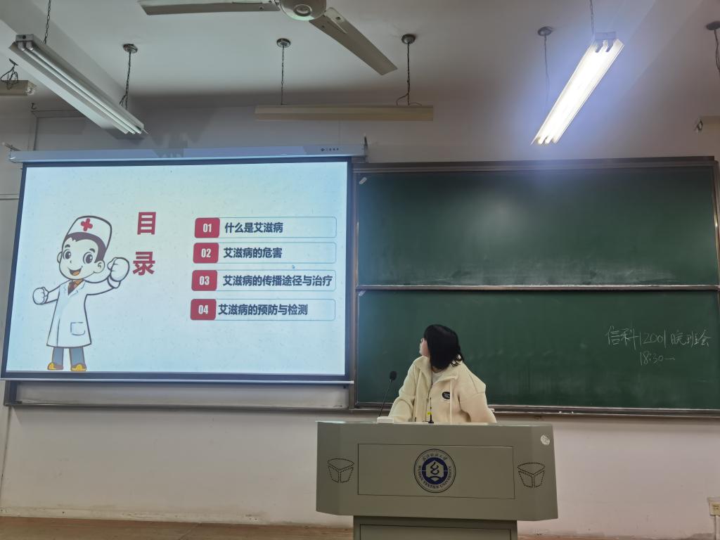 为提高同学们对防艾的认识和自我保护意识,倡导同学们关爱社会,关爱生命,关爱艾滋病人。11月14日晚,9428cn太阳集团学生易文芳、李慧君、马雪琴三位同学分别于崇志楼、崇文楼在20、21级的班会上组织开展预防艾滋病的宣讲活动。