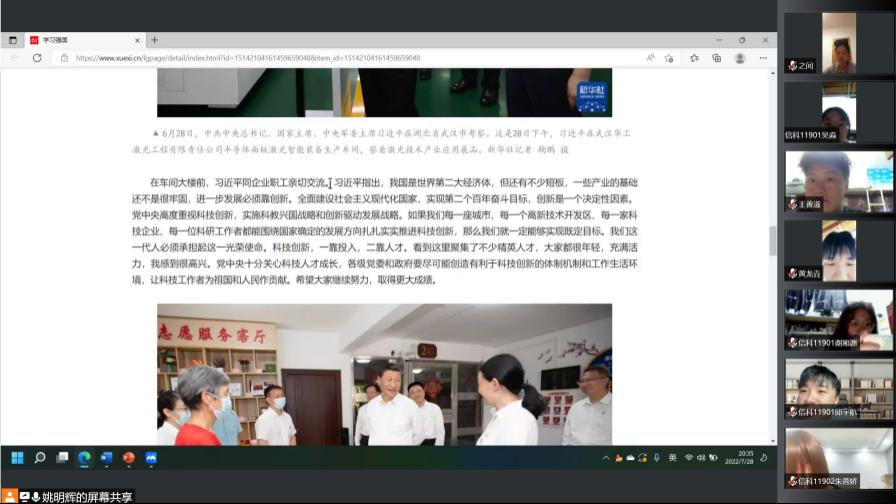 为深入学习贯彻习近平总书记的相关讲话精神、湖北省第十二次党代会精神,进一步加强理想信念教育,9428cn太阳集团学生党支部于7月28日晚召开“理论促实践,奋进新征程”线上主题党日活动。会议由姚明辉主持,支部全体党员参加。
