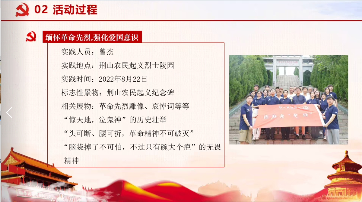 暑期实践活动分享。邵曼婷同志作为暑期红色实践队的代表,与大家分享了所作所为、所思所感。来自不同地区的八名党员以各自家乡为实践基地,通过走访探寻红色文化、参加当地社区的志愿服务、参加学校组织的支教活动等,在实践中去学习和探索家乡党史,于实践中锤炼优良品质,领悟党员的职责所在,从革命先辈的披荆斩棘奋斗历程汲取智慧。