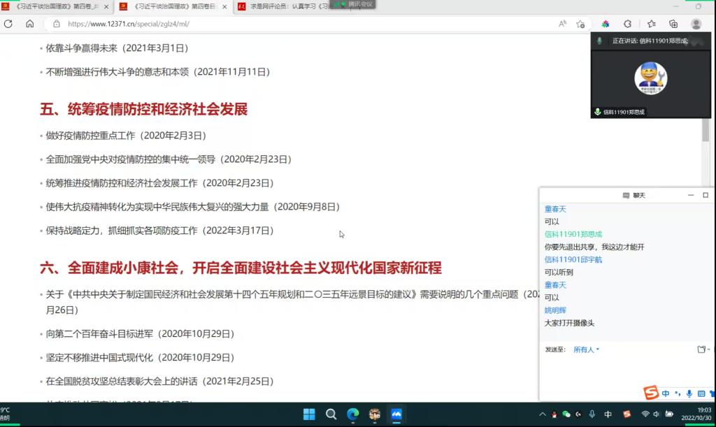 邱宇航同志领学关于二十大报告必须知道的“关键词”。交流学习心得时,他谈到,学生党员要全面学习、全面把握、全面落实党的二十大精神,带头学习贯彻,切实把思想和行动统一到党的二十大精神上来。作为学生党员,要以优秀党员的标准更加严格要求自己,加强思想淬炼、牢记职责使命,在新的征程上,践行“四个始终”的精神。