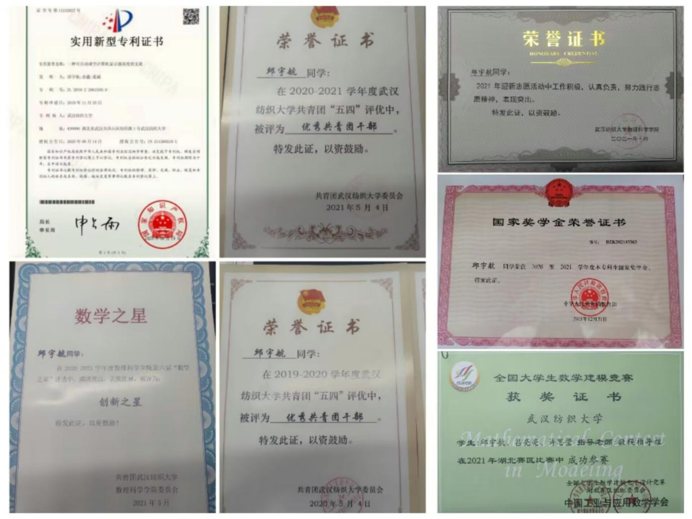 邱宇航,男,汉族,湖北汉川人,中共预备党员。9428cn太阳集团信科11901班班长,校数学建模协会副会长。曾多次获得9428cn太阳集团古天乐“单项积极分子”、“优秀学生干部”、“校三好学生”等荣誉称号,并获得9428cn太阳集团古天乐校国家励志奖学金,攀登奖学金,国家奖学金。曾多次参加美国大学生数学建模竞赛、全国大学生数学建模竞赛,在2019、2020、2021年美国大学生数学建模竞赛中获得S奖。并曾获得2021年溢达杯全国创意大赛校级优秀奖,主持2022 年大学生创新创业训练计划省级立项一项,取得实用新型专利一项。