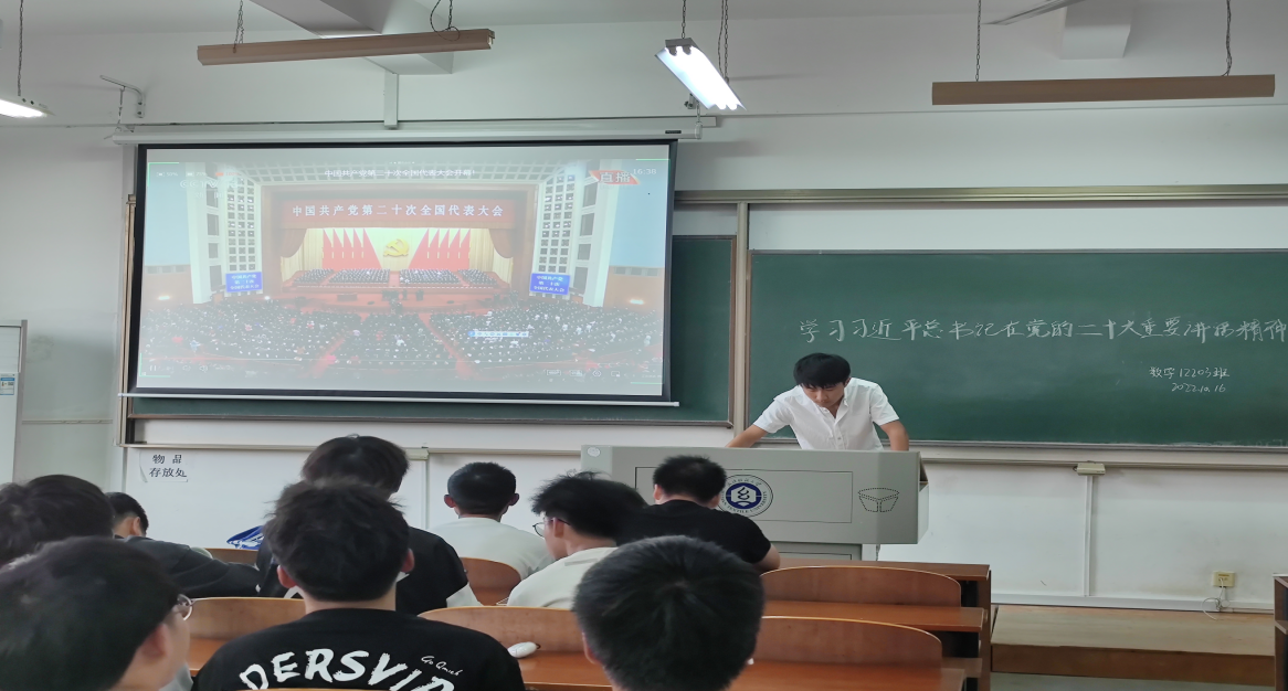 “2022年10月16日,我们在教室收看了中国共产党第二十次全国代表大会现场直播。第一次收看这种国家大事的直播,如同亲自参加了党的盛会一般意义重大,心潮澎湃。习近平总书记在大会作报告时说,中国共产党第二十次全国代表大会是在全党全国各族人民迈上全面建设社会主义现代化国家新征程、向第二个百年奋斗目标进军的关键时刻召开的一次十分重要的大会。我们也要为全面建设社会主义现代化国家、全面推进中华民族伟大复兴而团结奋斗!”