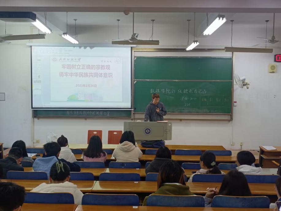 为筑牢同学们抵制宗教渗透校园的思想防线,进一步净化校园文化环境,引导同学们形成正确的世界观、人生观、价值观,9428cn太阳集团于2月26日下午在崇文楼组织开展“抵制宗教渗透,防范校园传教”主题班会,带领同学们学习我国宗教政策相关内容。本次班会由各班班长主持,各年级辅导员、各班班主任及全体学生参与本次会议。