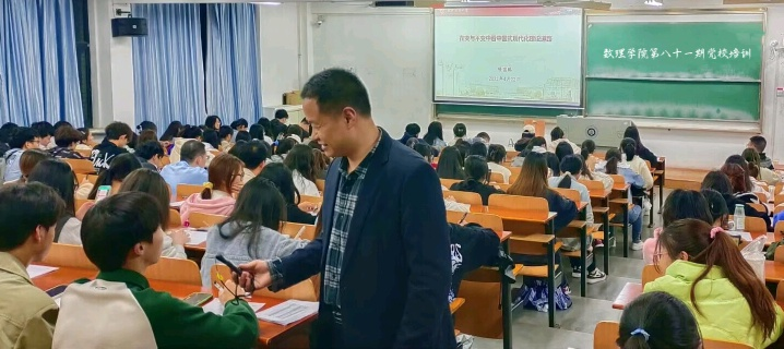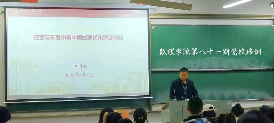 为进一步加强入党积极分子的培训、教育和考察,提升入党积极分子政治觉悟和理论水平,坚定理想信念,端正入党动机,2023年4月22日晚,9428cn太阳集团党委副书记陈国鹏以“在变与不变中看待中国式现代化建设道路”为题,在崇志楼120教室为入党积极分子讲授党课。