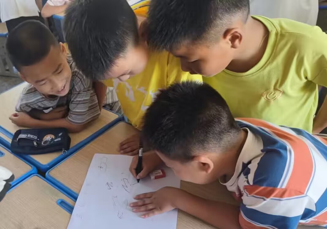 第一天的活动饱含着热情与期待,志愿者与小朋友们共同展开了一段难忘的旅程。破冰仪式正式开始后,志愿者们首先向大家进行自我介绍,一字一句中都洋溢着满心的欢喜和对支教活动的热爱。这个简单而温暖的自我介绍环节不仅拉近了志愿者与孩子们之间的距离,更为后续的团队分组活动奠定了基础。为了帮助小朋友们更好地相互认识,志愿者们组织了一系列破冰游戏和团队建设活动。孩子们分成小组,由不同的志愿者带队进行队伍组建与队徽队名设计。他们共同克服挑战,互相支持,激发了团队合作的精神。随后,由志愿者带队进行小组展示,每一张精巧的图画都代表着团队的凝聚,响亮的小组口号充斥在整个教室,伴随着同学们的欢声笑语,本次开班破冰仪式正式结束。