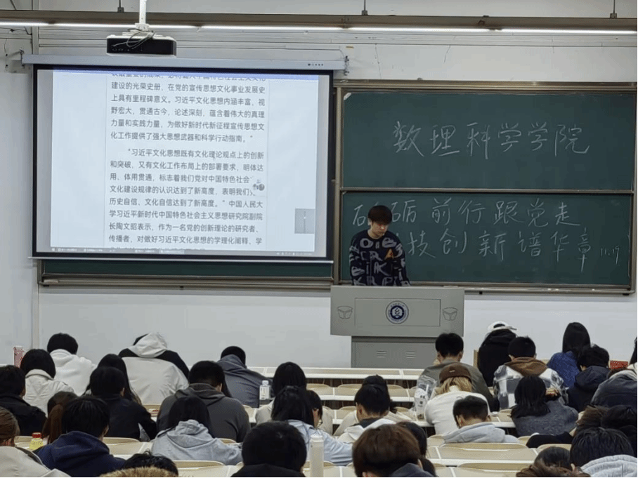 会议最后,数学类12301班团支书邓子桓同学带领同学们深入学习贯彻习近平总书记重要指示和全国宣传思想文化工作会议精神。