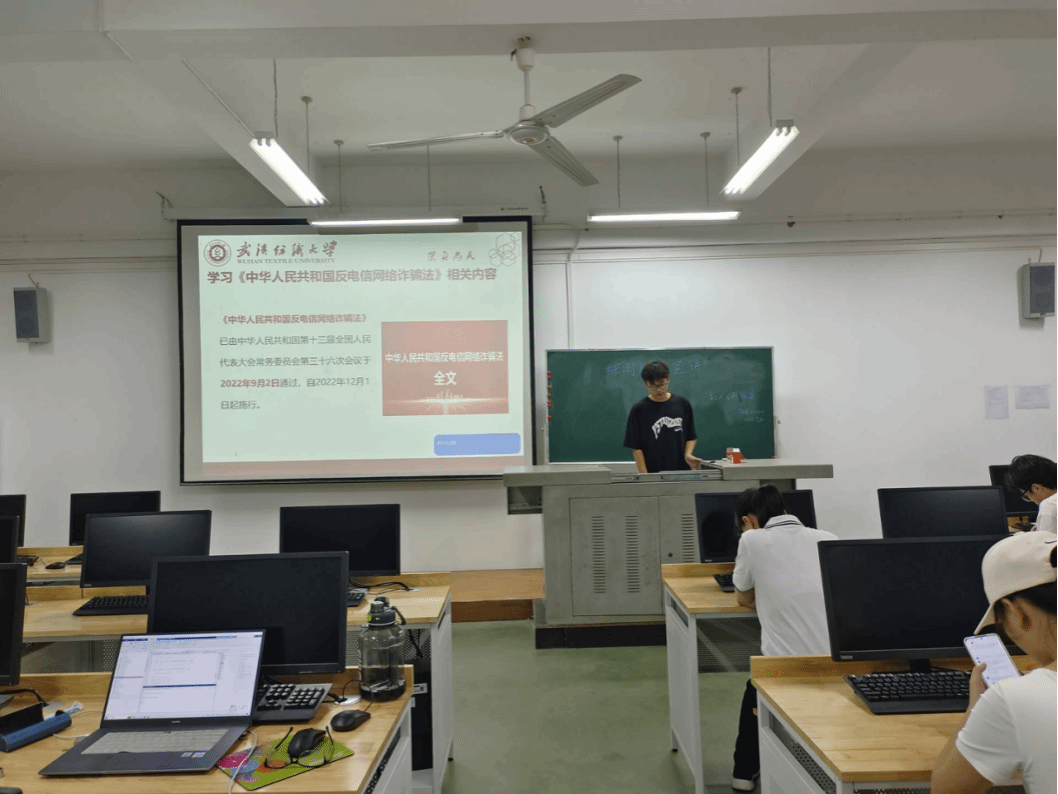 接着,各班班长开展预防电信网络诈骗知识普及,共同学习《中华人民共和国反电信网络诈骗法》相关内容,牢记十大反诈公式。提高了同学们的防范意识。