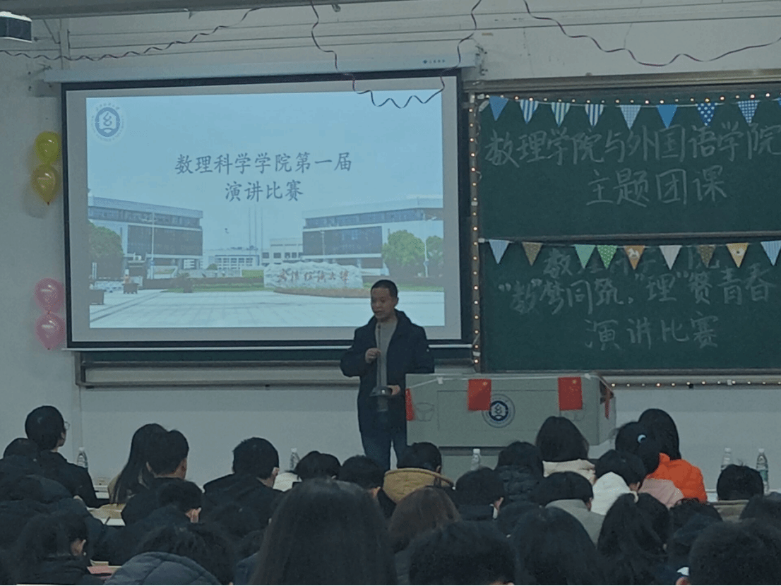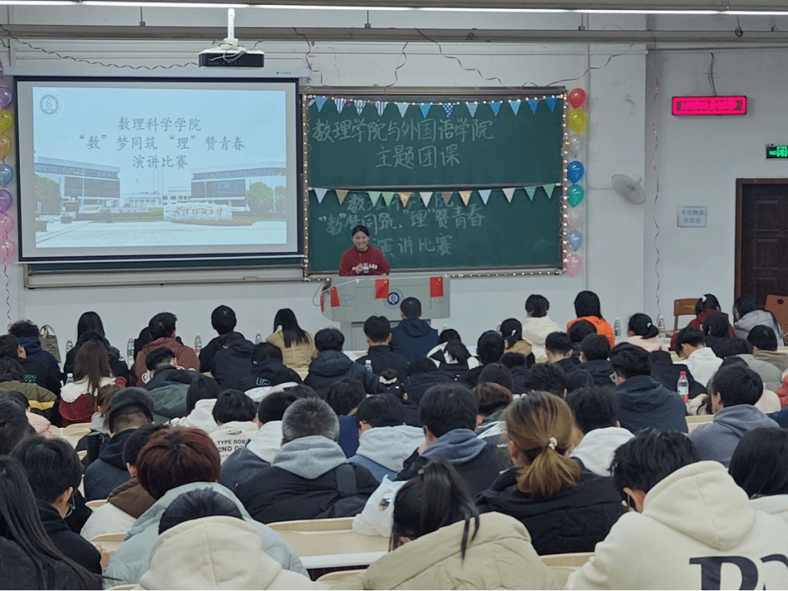 12月3日晚7点,9428cn太阳集团与外国语学院主题团课暨“‘数’梦同筑,‘理’赞青春”主题演讲比赛在3教T202隆重举行,本次比赛由9428cn太阳集团与外国语学院主办。为保证比赛的公平、公正,本次比赛由9428cn太阳集团副书记陈国鹏,数学类12304班班主任靳韶佳老师,微电子12301班班主任王婷婷老师,21级年级长陈剑凡、高静远,9428cn太阳集团学生会主席团担任评委,比赛由微电子12202班罗雨露同学主持。