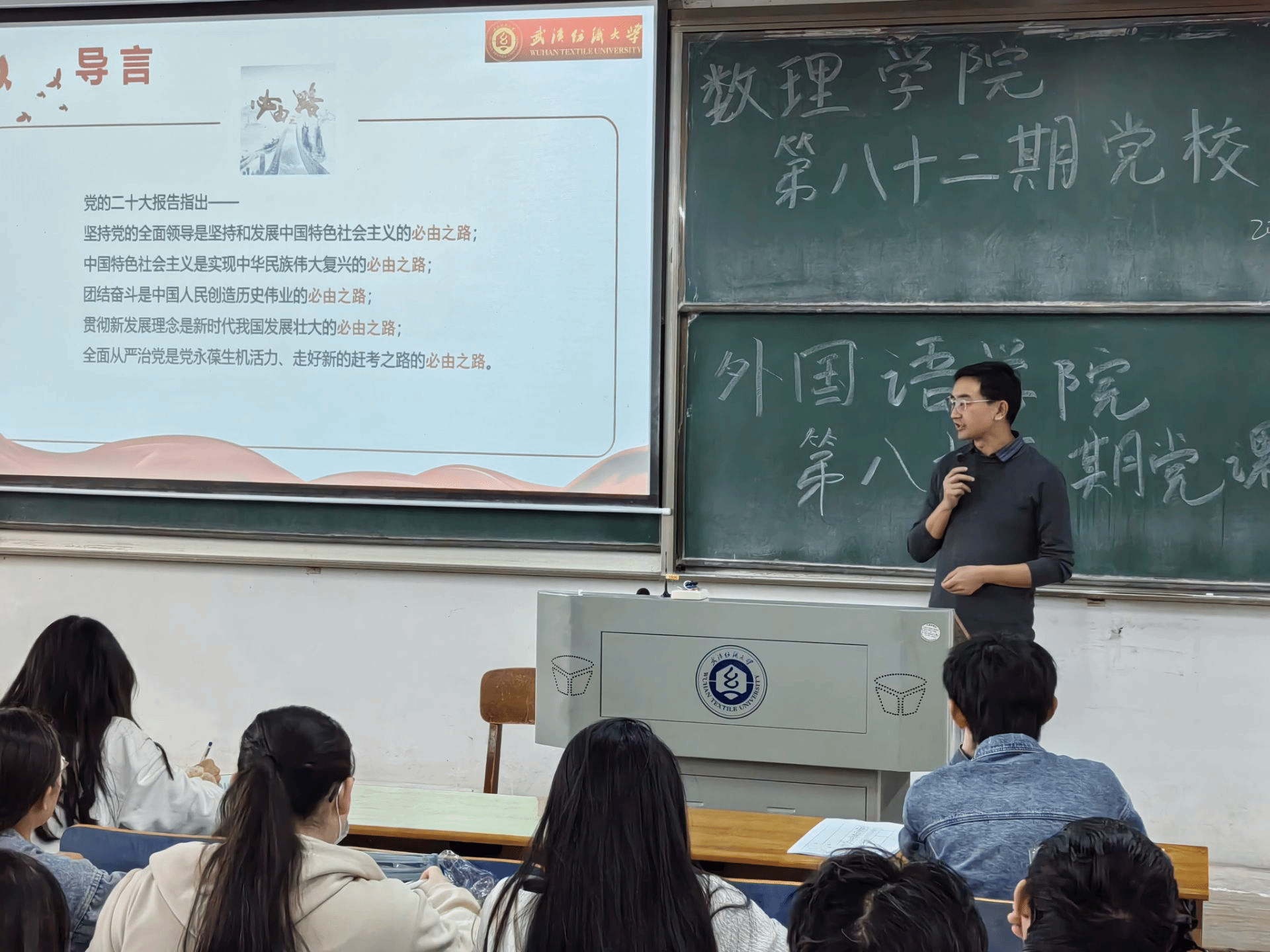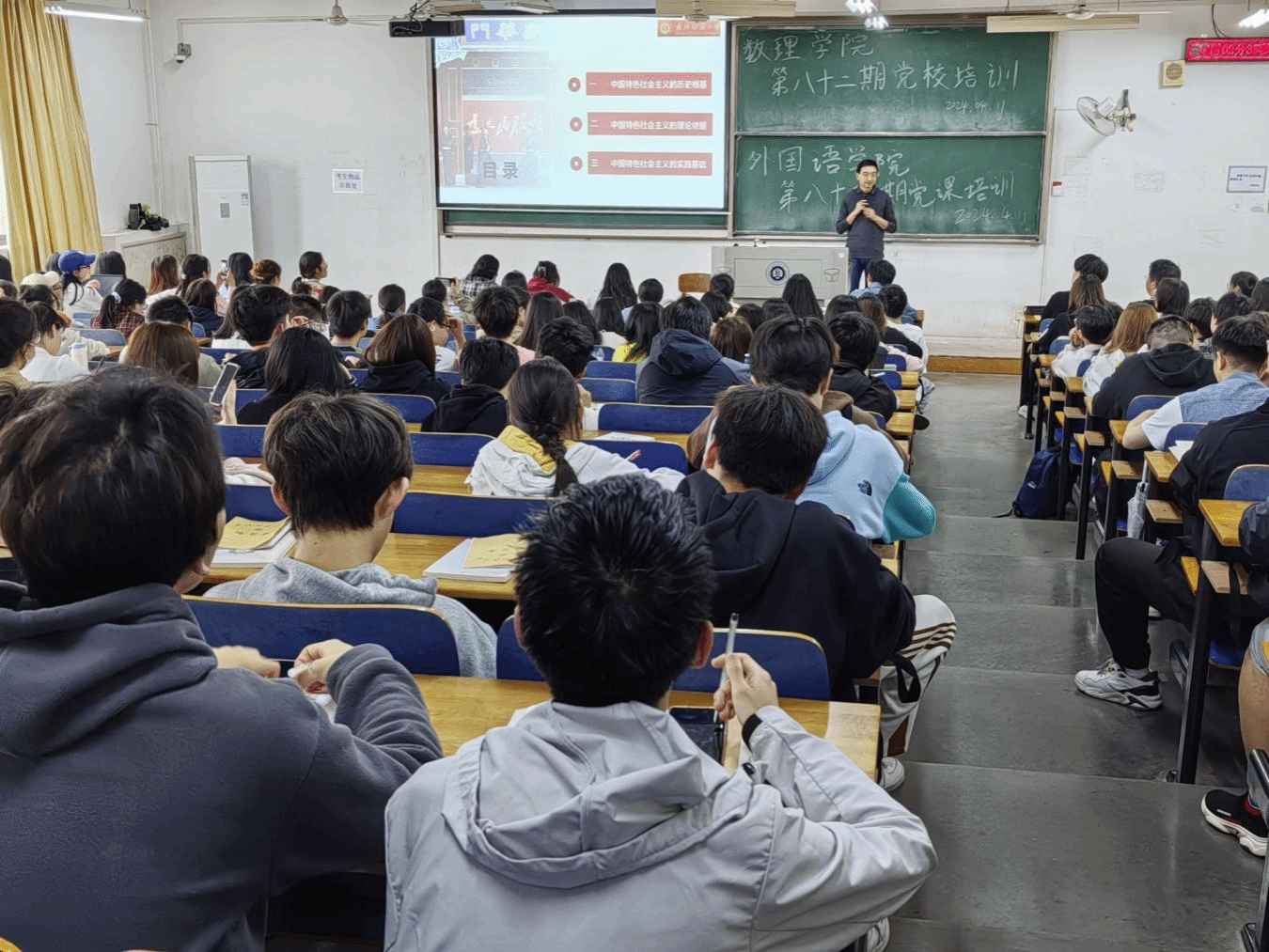 2024年4月11日下午,9428cn太阳集团、外国语学院在崇真楼联合举办第82期入党积极分子党校学习,第一讲由马克思主义学院的汪书路老师以“中国特色社会主义的历史根基、理论依据和实践基础”为题授课,9428cn太阳集团和外国语学院的入党积极分子参加。