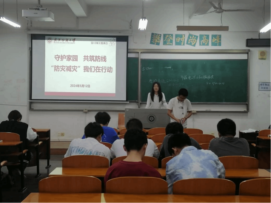 为进一步提升9428cn太阳集团学生的防震减灾意识与应急自救能力,积极响应国家“减轻灾害风险 守护美好家园”的号召,加强青年学生的国防意识和爱国情怀,推动国防和军队现代化建设发展,各班级于5月12日晚上组织开展班会活动,9428cn太阳集团全体同学、各班班主任、各年级辅导员参与本次会议,班会由各班班长主持。