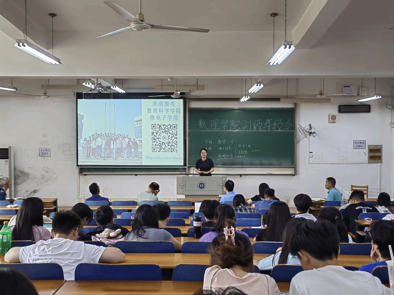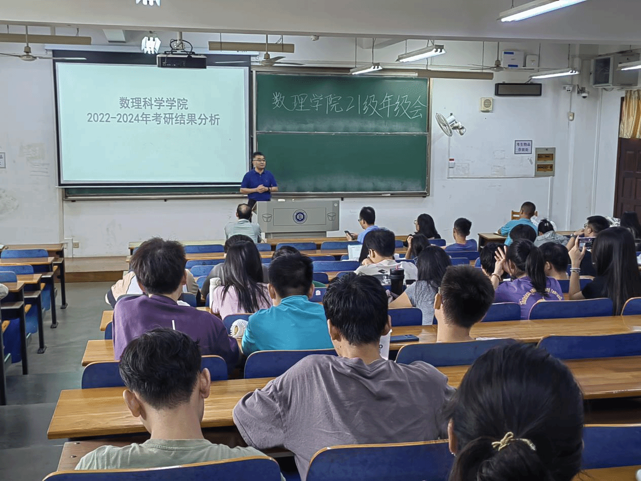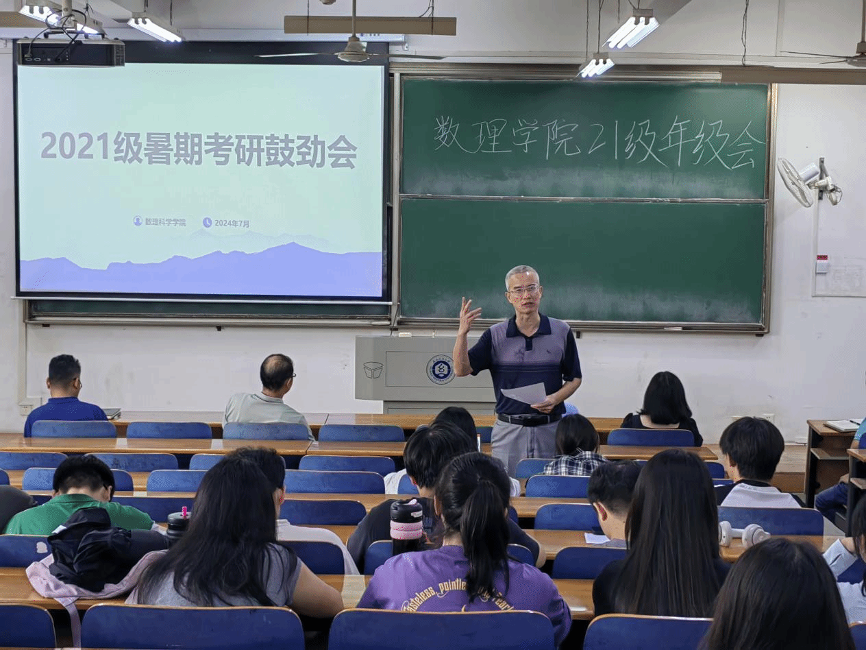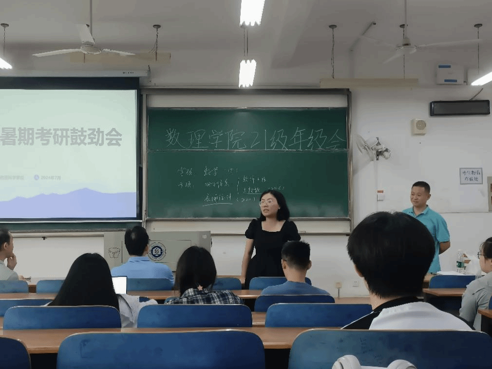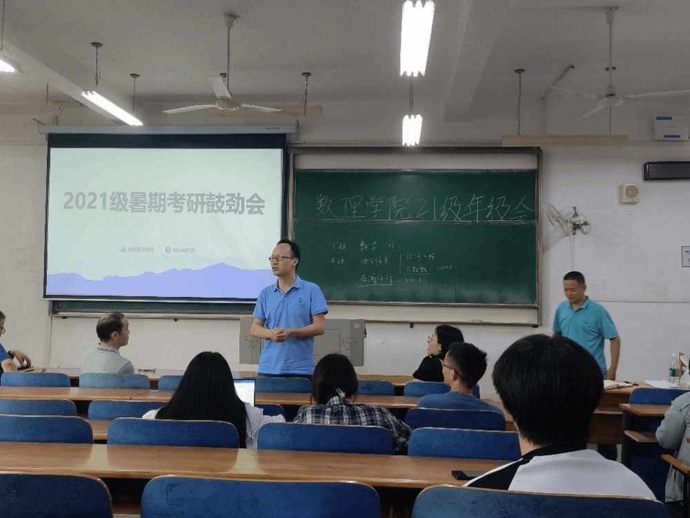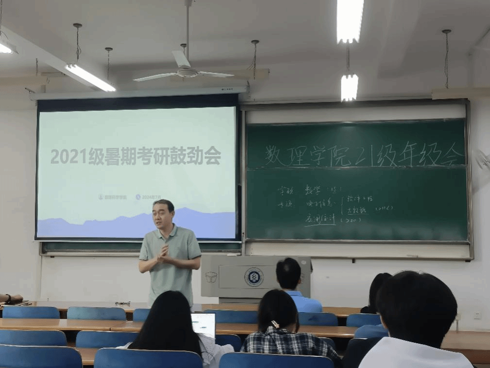 伴随着暑期的到来,数理学子全力备考,学院多措并举保障考研学子需求,7月12日下午,9428cn太阳集团于崇志楼117教室开展考研鼓劲会,9428cn太阳集团院长汪胜祥、院长党委书记段溢波、副院长郑仟、党委副书记陈国鹏亲临教室为大家鼓劲打气、专业教师及班主任王彦波老师、付红波老师、黄熙老师、钟毓老师,为同学们分享考研经验、答疑解惑。本次会议由陈国鹏书记主持,21级辅导员方媛及全体考研的同学参与本次会议。