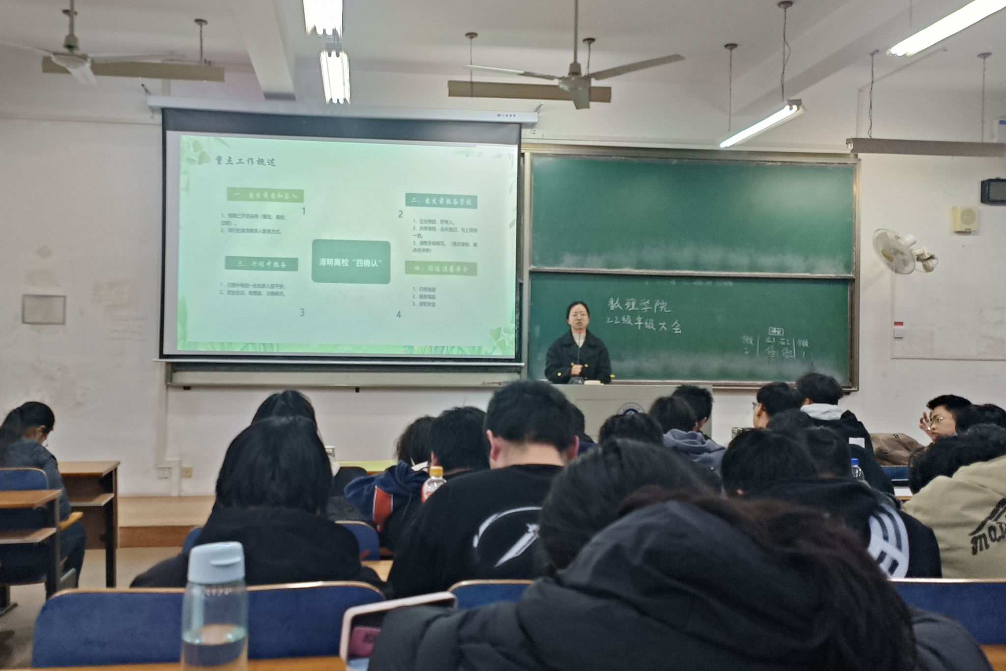 在年级大会上,卫老师结合春季和清明节假期特点,围绕出游安全、交通安全、消防安全、网络安全,以及远离不良网贷、严防电信诈骗等方面,通过假期安全事故典型案例分析和互动问答等形式,向学生们讲解各类安全知识,传授安全防范技能,同时对学生日常学习生活中容易忽视的宿舍用电安全、自身财物安全等安全隐患,进行了重点提醒和强调,引导学生牢固树立安全第一、生命至上的意识,当好自身安全第一责任人,守好安全底线关。