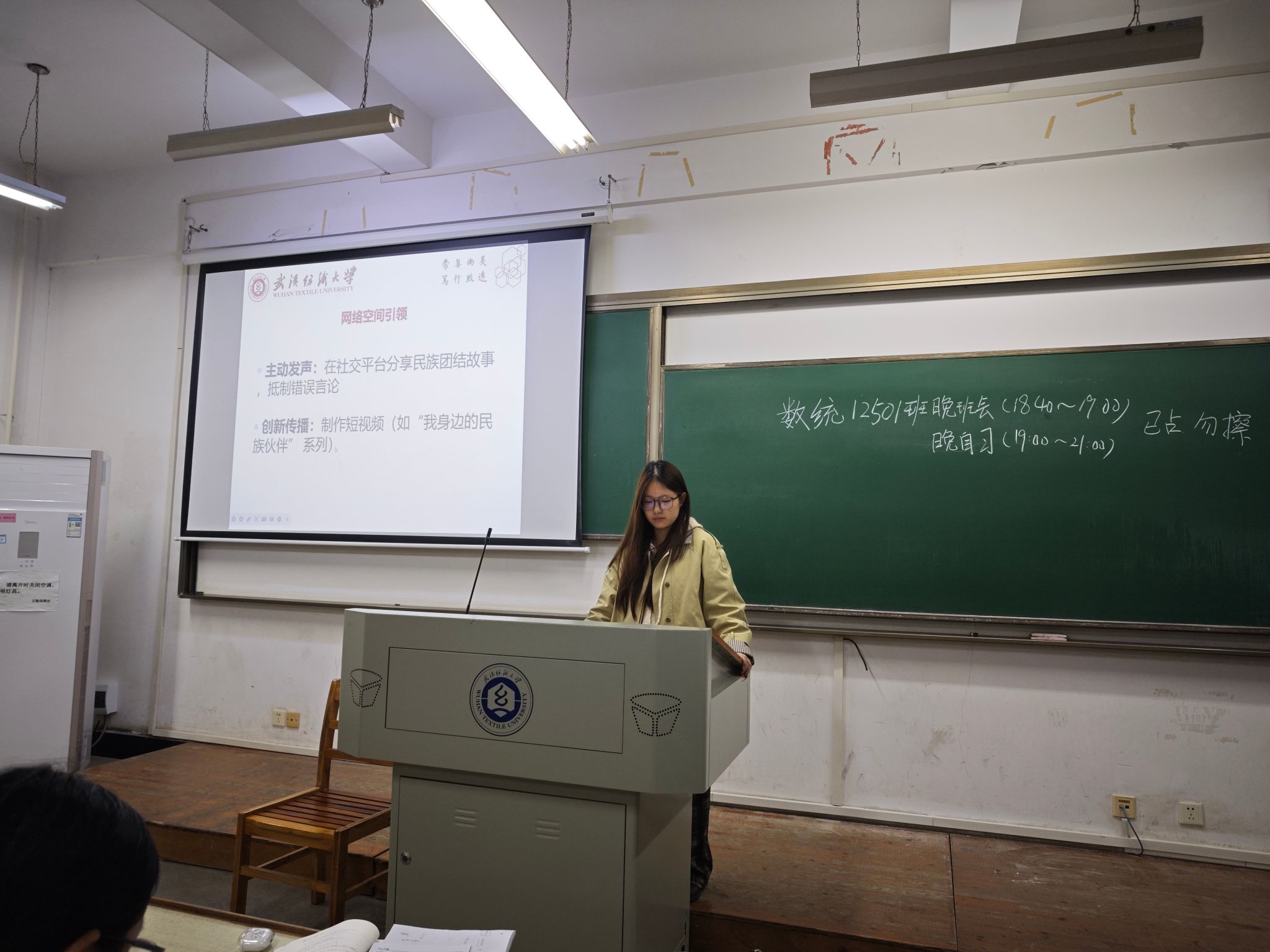 会议最后,班长对班会进行总结升华,希望同学们以此次班会为契机,深刻认识新时代青年的使命担当,将民族团结意识内化于心、外化于行,在学习生活中主动维护民族和谐,用青春力量为中华民族伟大复兴贡献力量。