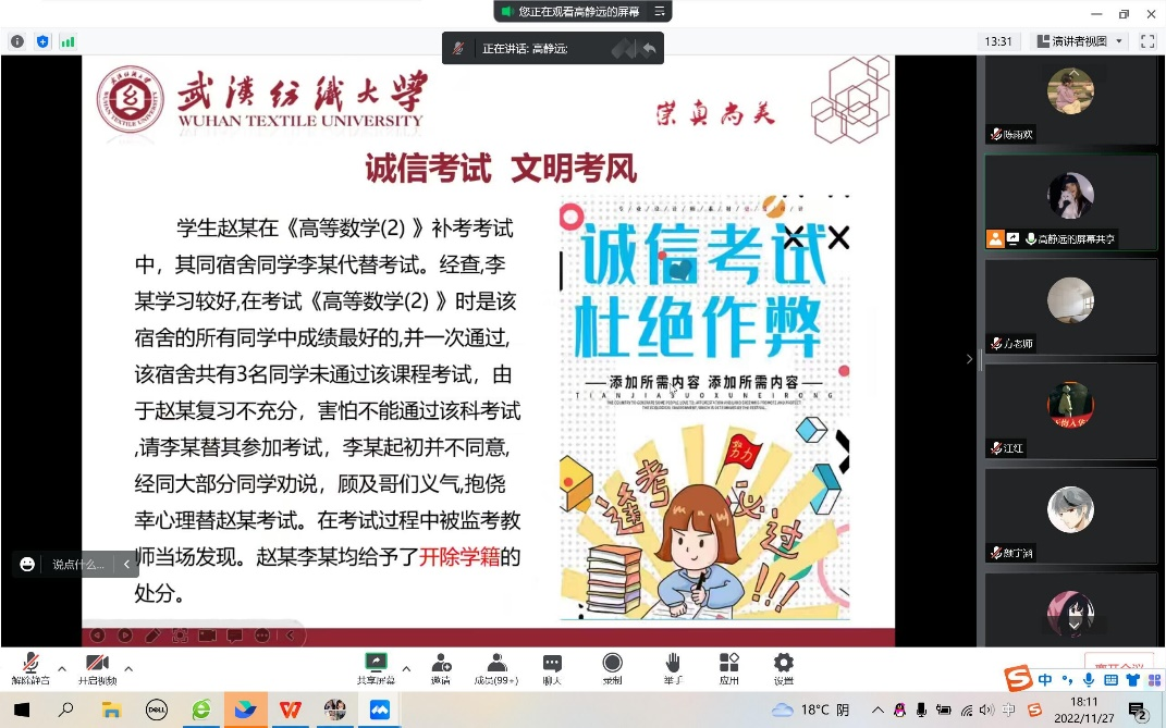 辅导员方媛向大家补充说明征兵入伍的细则以和注意事项。另外关于疫情防控、诚信应考、防诈骗等方面内容进行了宣讲。强调在当前疫情防控的严峻形势下,同学们做好个人防护,筑牢“每个人都是自己健康的第一责任人”意识。
