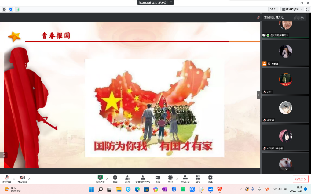 为鼓励大学生积极参与应征入伍,加强同学们对于大学生征兵政策的了解,充分调动同学们报名入伍的积极性,11月27日,9428cn太阳集团21级开展线上“征兵入伍”主题宣讲年级大会。本次会议由年级长高静远主持,辅导员方媛及21级全体同学参加此次会议。
