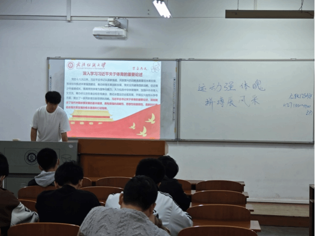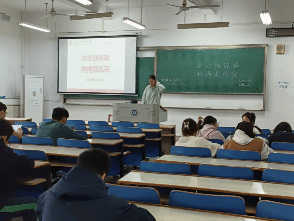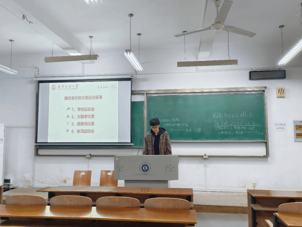 接着,各班班长向大家介绍了纺大体育精神。首先介绍了我校举办的大型运动赛事,包括学校运动会、太极拳比赛、健身操比赛、体测运动会。同时强调了近期开展的2024-2025学年第一学期的大学生体质健康测试的通知,包括体测时间、地点和项目。向各位同学展示我校的运动赛事的盛大场景,各位运动员在赛场上拼搏的英姿以及我校运动赛事取得的累累硕果。