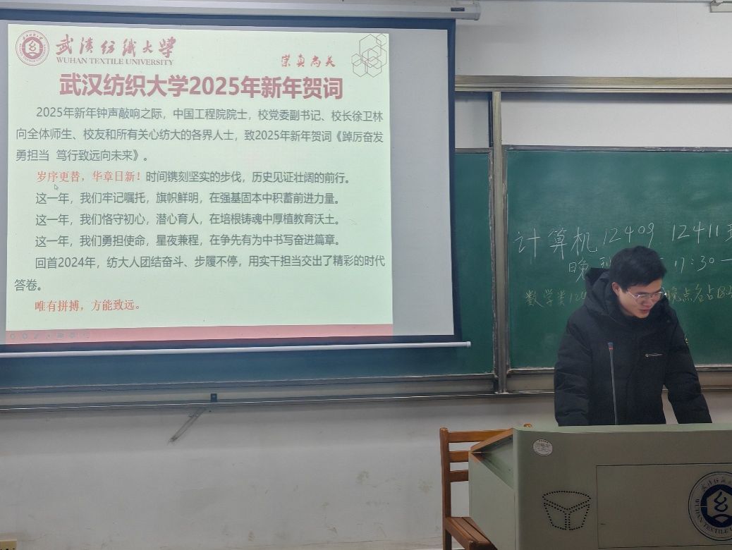 会议伊始,各班团支书向我们讲解了在新年贺词中,国家主席习近平回顾了2024年不平凡的历程,指出世界百年变局加速演进,中国以宽广胸襟超越隔阂冲突,推动构建人类命运共同体。9428cn太阳集团古天乐也在新年贺词中回顾了过去一年的奋斗历程,强调牢记嘱托、潜心育人、勇担使命,展望2025年,学校将踔厉奋发、笃行致远,为实现更高目标而努力。