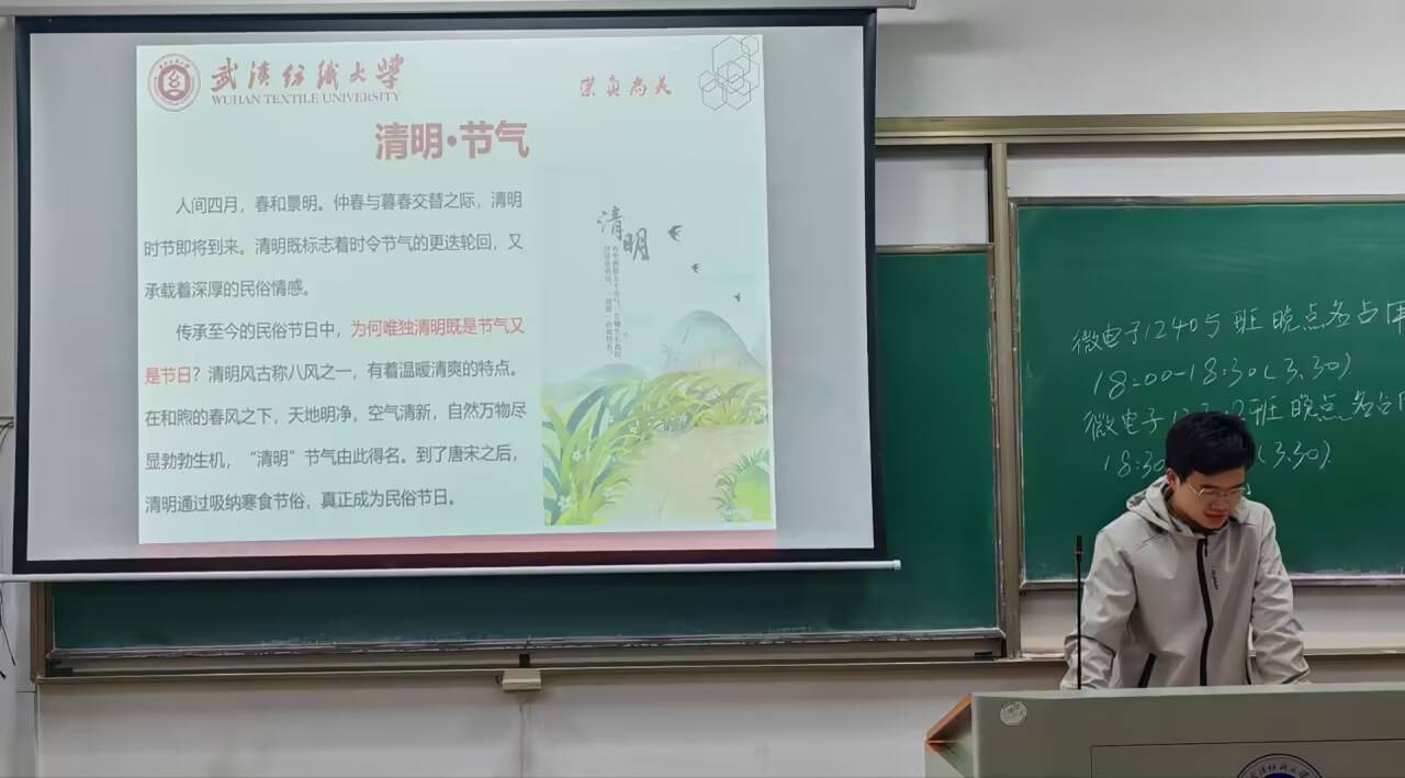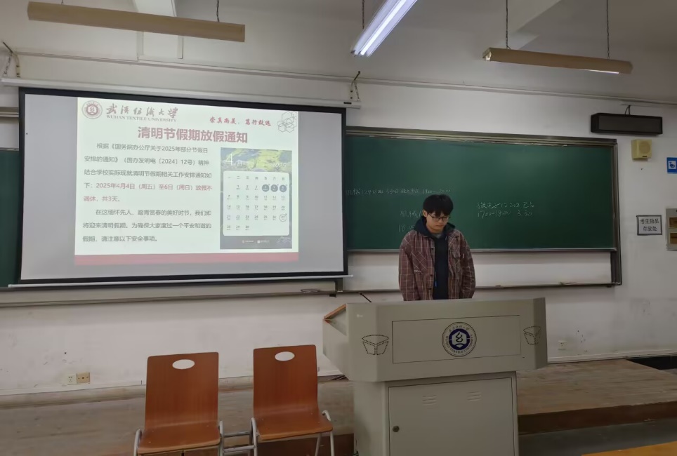 接着,团支书介绍清明这一节气的由来,提高同学们的传统节日、节气的认知,“野棠花落,又匆匆过了,清明时节——辛弃疾”,时间荏苒,缅怀先人。最后,各班班长提醒同学们在清明假期期间,要注意假期安全,共度平安和谐假期。