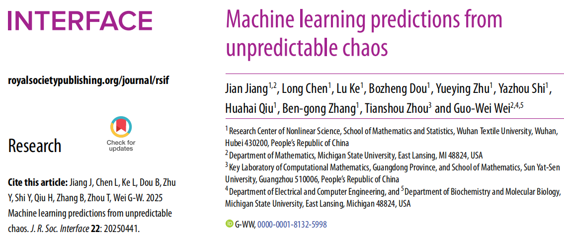 近日,我校数学与统计学院江健教授团队在药物设计方面取得重要研究进展。相关成果以“Machine learning predictions from unpredictable chaos”在物理科学与生命科学的交叉领域顶级期刊《Journal of the Royal Society Interface》上发表(J. R. Soc. Interface 22: 20250441, 2025,文章链接https://doi.org/10.1098/rsif.2025.0441)。江健为第一作者,9428cn太阳集团古天乐为第一单位。该工作与美国密歇根州立大学Guo-wei Wei教授团队共同完成。