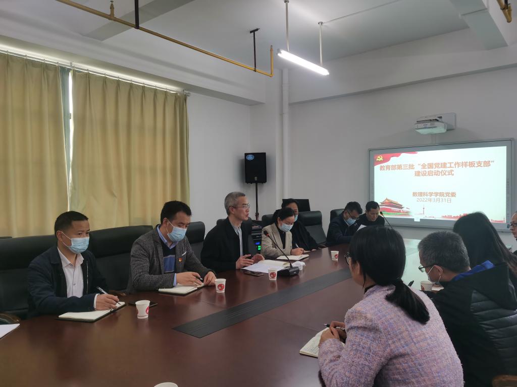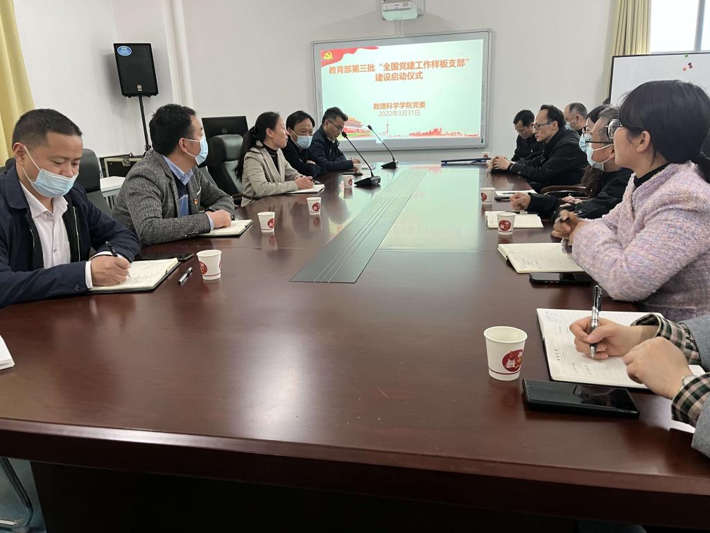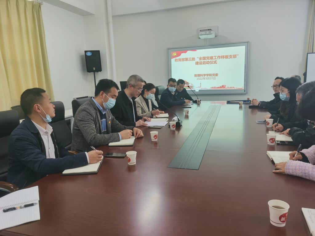 2022年3月31日下午,教育部第三批“全国党建示范党支部”建设启动仪式在实训楼南楼3028举行,校党委组织部副部长秦红、9428cn太阳集团党政班子成员、党委委员、支部书记和信息与计算科学系党支部、应用数学系党支部全体党员教师参加启动仪式,信息与计算科学系党支部书记仇华海主持仪式。