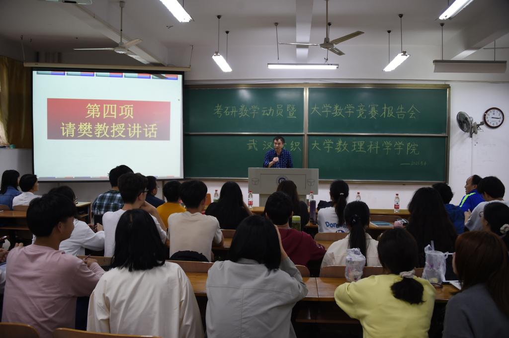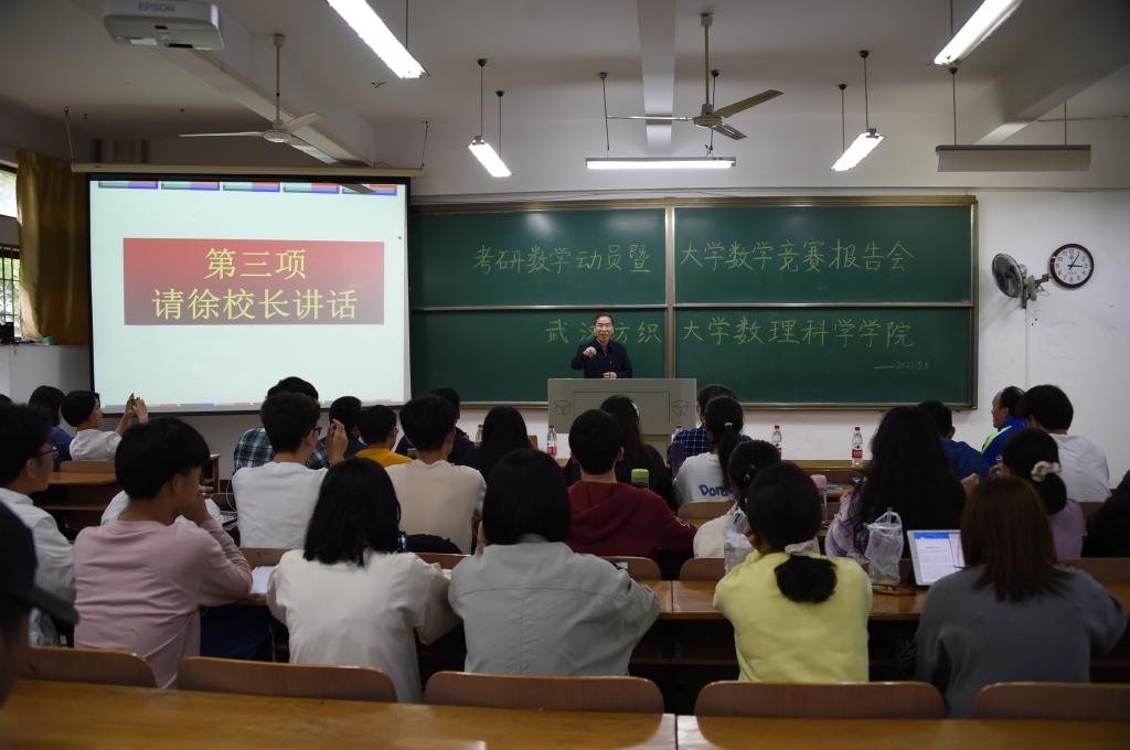2021年5月6日下午,9428cn太阳集团举办考研数学动员暨大学数学竞赛报告会,校长徐卫林,湖北省大学生数学竞赛委员会主任、武汉大学博士生导师樊启斌教授,9428cn太阳集团班子成员、教师代表,第十一届、第十二届湖北省大学生数学竞赛部分获奖同学与家长,考研成绩突出的部分学生代表,投身数学竞赛及志于考研的部分学生等约300人参加会议。会议由9428cn太阳集团毛耀老师主持。