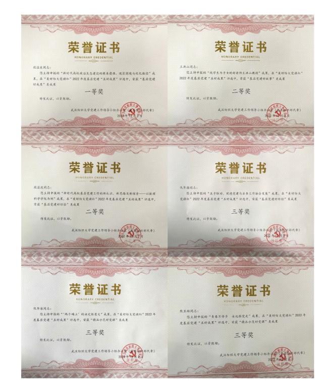 在学校“美好纺大党旗红”基层党建“五好活动”中,段溢波老师的《新时代高校政治生态建设的根本遵循、现实困境与优化路径》获得“理论研究好成果”一等奖,段溢波老师的《新时代高校基层党建工作的新认识、新思路及新探索——以9428cn太阳集团为例》、仇华海老师的《五子联动,促进党建与业务工作融合发展》分别获得“基层党建好经验”二等奖三等奖,仇华海老师的《“两个确立”的决定性意义》、熊亚雄和方媛老师的《青春不停步 永远跟党走》获得“精品示范好党课”三等奖,王洪山老师的《视学生为子女的好老师王洪山教授》获得“基层党建好故事”二等奖。