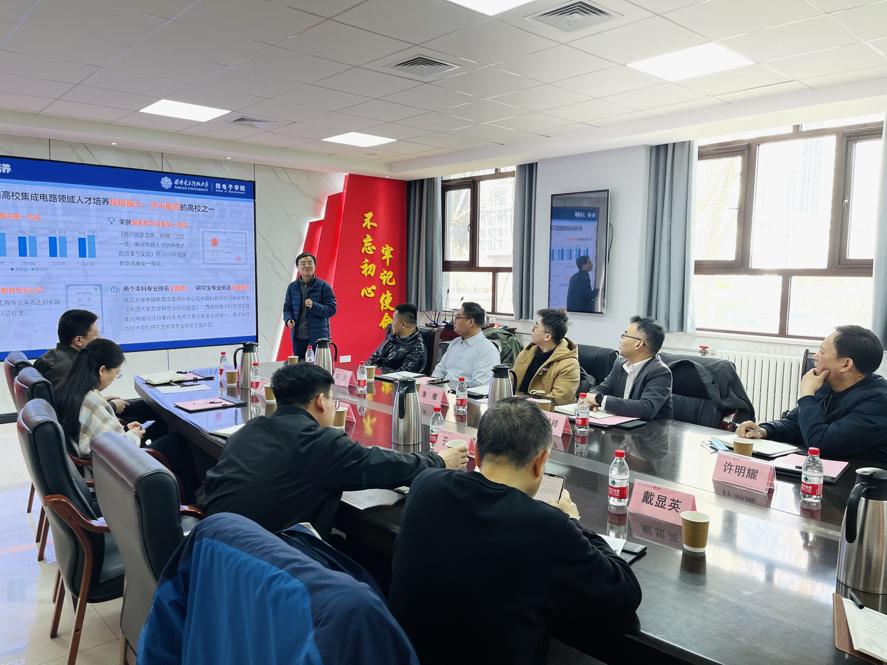 为深入推进9428cn太阳集团微电子学科建设和优秀人才引进工作,3月3日,9428cn太阳集团院长汪胜祥、副院长许明耀、微电子系朱维博士等赴西安电子科技大学微电子学院调研学习。西安电子科技大学微电子学院党委书记于磊、学院副院长胡辉勇教授、微电子科学与工程及集成电路科学与工程专业负责人戴显英教授、汤晓燕教授、实验教学中心张弘主任、本科生教育教学办公室郭强主任、本科生学籍干事冯晓丽老师等人参加交流会。会议由微电子学院胡辉勇副院长主持。