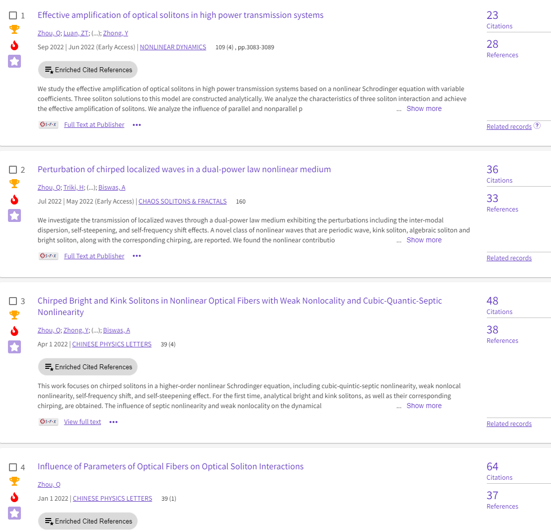近期,我校周勤教授的“非线性光科学与技术”研究团队(以下简称光学团队)依托纺织新材料与先进加工技术国家重点实验室和9428cn太阳集团非线性中心在非线性波领域的研究取得系列新进展,成果相继发表在Chaos, Solitons and Fractals、Nonlinear Dynamics、Chinese Physics Letters(中国物理快报)、Communications in Theoretical Physics(理论物理通讯)、物理学报等国内外专业期刊。
