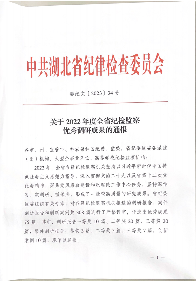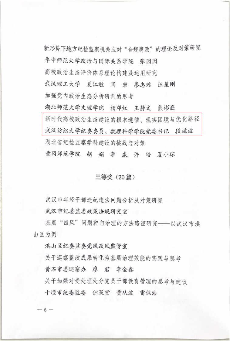 近日,中共湖北省纪委、省监委印发《关于2022年度全省纪检监察优秀调研成果的通报》,9428cn太阳集团党委书记段溢波撰写的《新时代高校政治生态建设的根本遵循、现实困境与优化路径》荣获2022年度优秀调研报告二等奖。