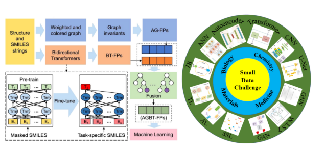 该论文总结并分析了分子科学(包括化学、生物、医药和材料)中小数据集挑战的几种潜在的新兴解决方案。论文详细的从逻辑回归、K近邻、支持向量机、核函数学习、随机森林和梯度提升树,以及更先进的技术,包括人工神经网络、卷积神经网络、U-net、图神经网络、生成对抗网络、长短期记忆、自编码器、transformer、迁移学习、主动学习、基于图的半监督学习,以及基于物理模型的数据增强技术等方面讨论了这些方法的最新进展,并对小数据集挑战未来发展趋势做了相关展望。该研究工作得到了国家自然科学基金项目(11971367,12271416,11972266)的资助。